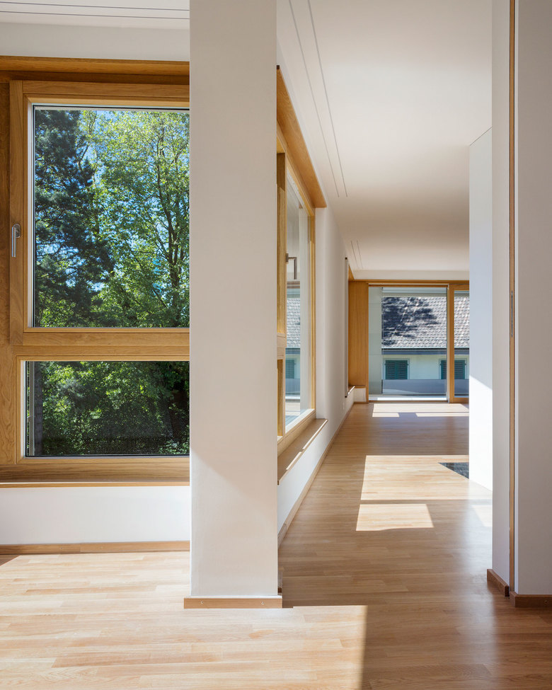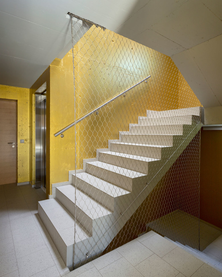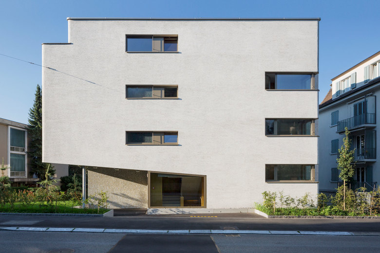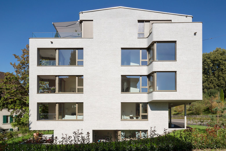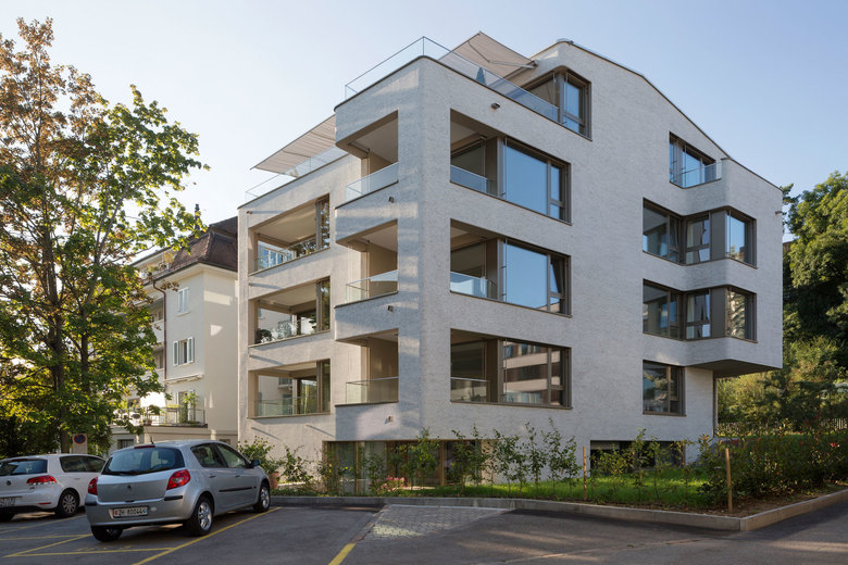 Das Grundstück zeichnet sich durch seine besondere Lage zwischen Breitensteinstrasse und Limmat aus. Im leichten Knick der Strasse positioniert, erlangt der Neubau eine eindrückliche städtebauliche Präsenz. Das als kompaktes kleines Volumen angedachte Gebäude wurde mit Erker- und Terrassenelementen plastisch durchgebildet. Gleichartige Ausbildungen der Öffnungen der Terrassenräume und der Fensteröffnungen bewahren die kompakte Wirkung. Auch die rund verschliffenen Gebäudekanten tragen zur Beruhigung der Gebäudethektonik bei und verstärken die steinerne Wirkung des zweifarbigen Strukturputzes der Gebäudeoberfläche. Die Zimmerfenster sind über die Erker lärmabgewandt angeordnet. Die Terrassen an den exponierten Gebäudesüdecken führen den Blick aus dem Wohnbereich in der Diagonalen auf den Limmatraum. Eine Besonderheit bildet die Ausgestaltung des Hauseinganges. Unter den Erker gelegt und in das Volumen eingeschnitten, gibt er dem Gebäude einen charakteristischen Ausdruck an der Breitensteinstrasse. Der Raum ist mit Klein-Mosaik ausgestaltet, wirkt wie eine Brosche an einem Kleid und steht im Dialog mit dem Strassenraum.