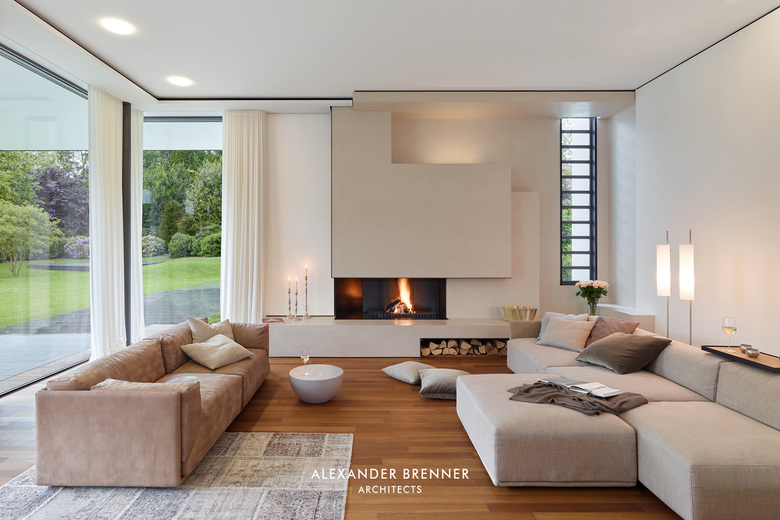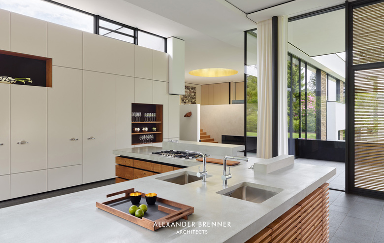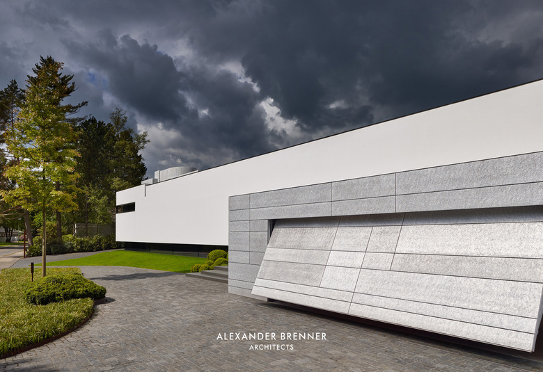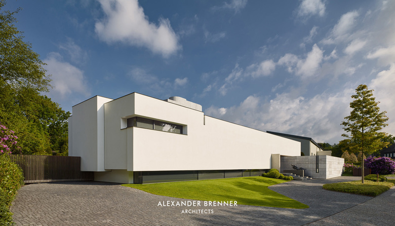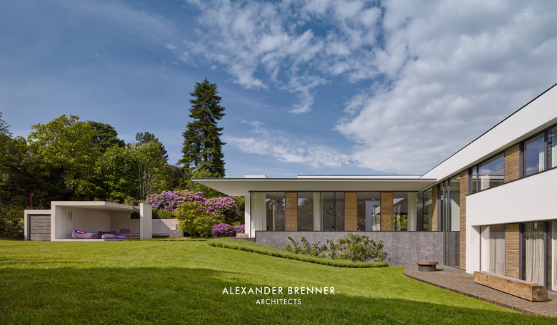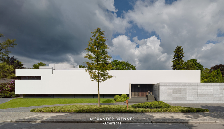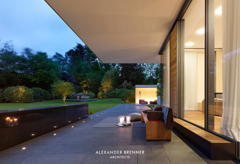 Alle bewohnten Räume öffnen sich über den inneren Winkel zum Garten hin, der im östlichen Teil von der lang gestreckten Terrasse gequert wird. Den Endpunkt der Terrasse bildet ein einfacher kubischer Gartenpavillon, der zu Haus und Garten hin offen ist und dem Außenbereich einen gebauten Eckpunkt hinzufügt.“ aus dem Buch „Alexander Brenner - Villas and Houses 2010-2015“