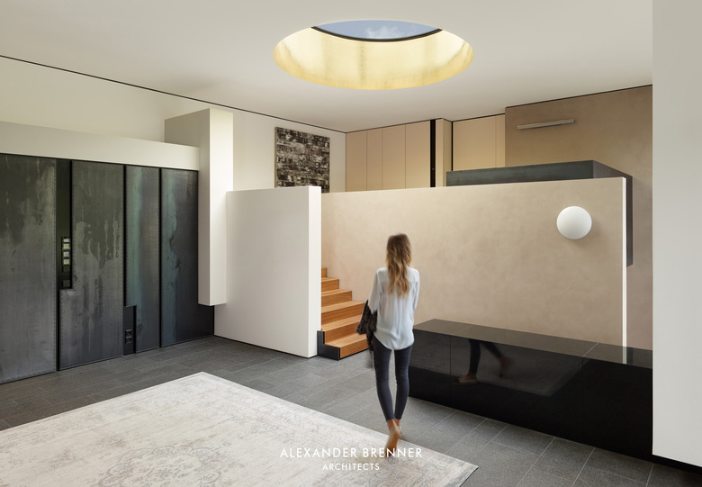 Das Programm im Inneren den Hauses folgt den Wünschen der Bewohner und liegt wie selbstverständlich auf der vorgefundenen Topografie. Das 4 Meter hohe Erdgeschoss mit Küche, Essen und Wohnen ist über eine Halle mit dem Flügel verbunden, in dem sich die Privaträume befinden. Ein halbes Geschoss höher als die Wohnebene liegt der Bereich der Eltern, während das Reich der Kinder und Gäste ein halbes Geschoss nach unten gestaffelt ist.