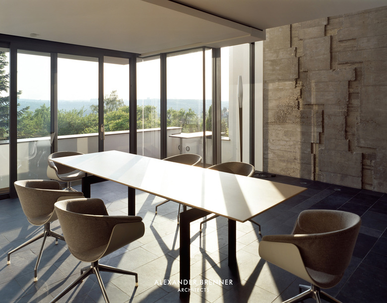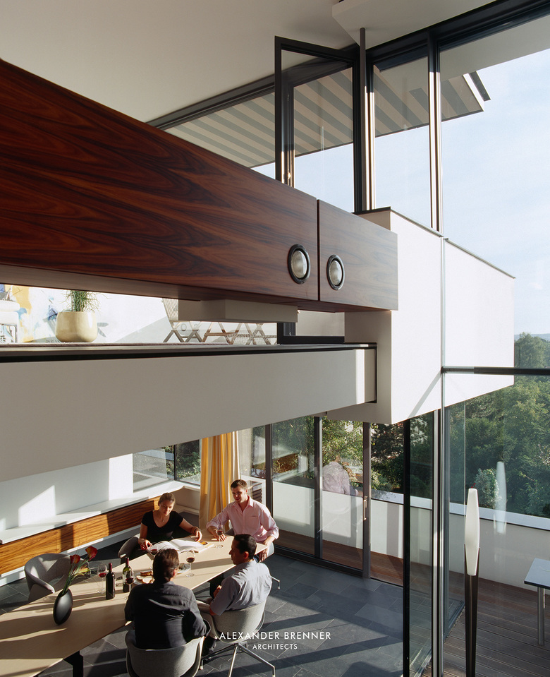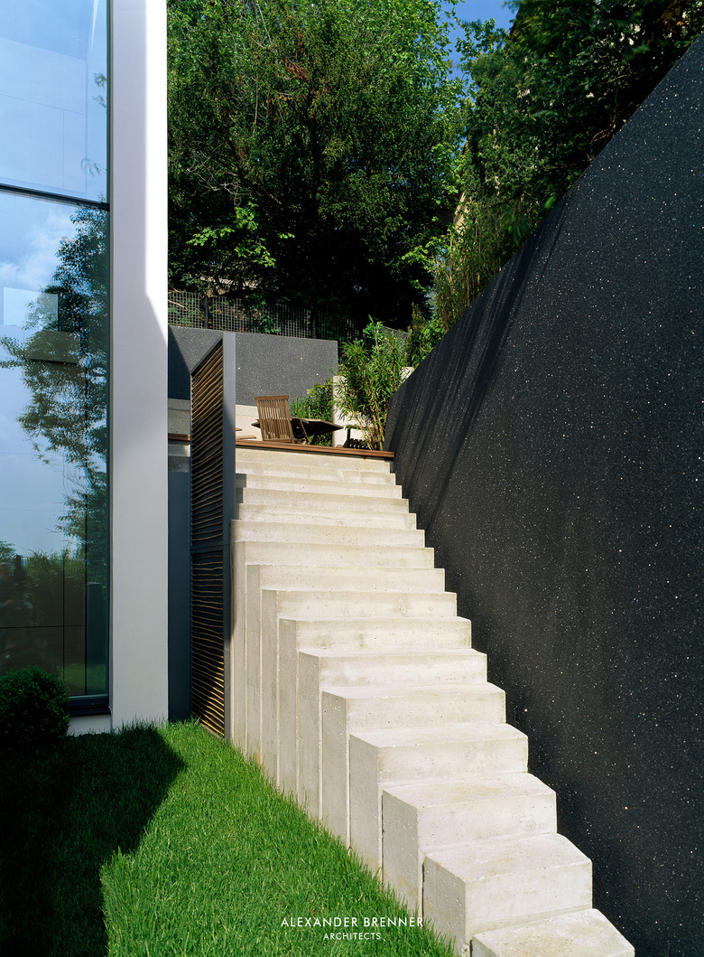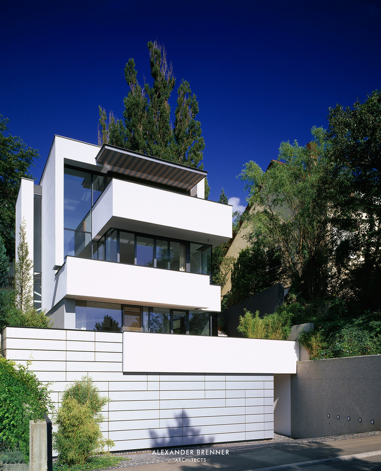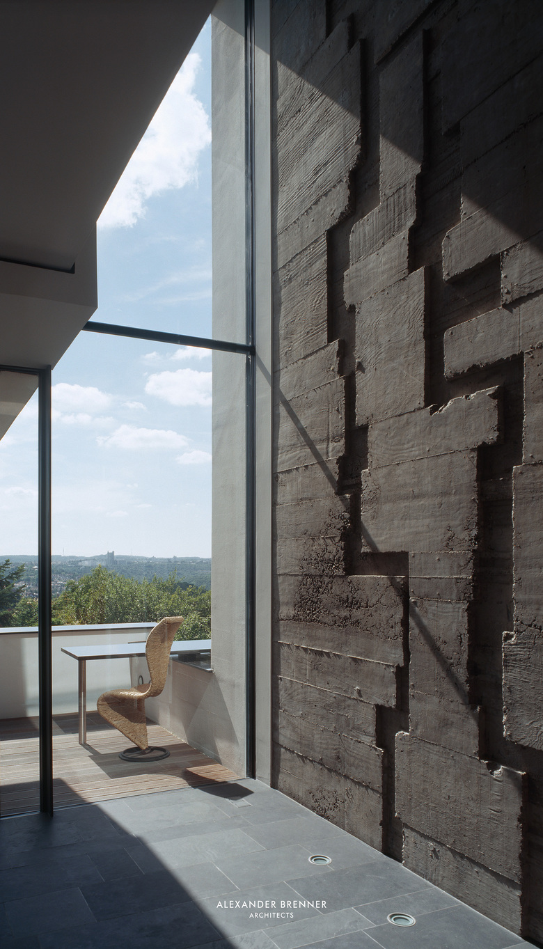 Das Baugrundstück, in einer Klinge am Steilhang gelegen, entstand durch die Mehrfachteilung eines ehemals größeren Gesamtgrundstücks. Die trapezförmige Restfläche von lediglich 273 Quadratmetern und mit einem Höhenunterschied von 8 Metern galt jahrelang aufgrund ihrer Dimension, ihrer Steilheit und des sehr schwierigen Baugrunds als unbebaubar. Da die Auftraggeber beruflich sehr stark eingebunden sind, galt es, gerade für die wenige verbleibende Freizeit vielfältige, differenzierte und gut nutzbare Freibereiche zu schaffen. Die Außenbereiche orientieren sich alle, wie auch das gesamte Bauwerk, zur Aussichtsseite. Die vier Ebenen des Hauses reichen entsprechend der Topografie dreiseitig sehr tief in den Hang. Diese Seiten sind auch oberhalb des Geländes weitgehend geschlossen. Alle Haupträume sind nach Südwesten zur Aussicht raumhoch oder geschossübergreifend verglast. Die weit auskragenden Geschossdecken, die durch die umlaufenden geschlossenen Brüstungen der Balkone körperhaft erscheinen, zeichnen zum einen das Bild des Hauses und schützen zum anderen die Wohnbereiche vor Einblicken aus dem Straßenraum. Um den Weitblick genießen zu können, wurden die Wohnräume in den oberen Etagen geplant. Innere Transparenz wird hier vor allem durch zwei Lufträume erzeugt. Der eine davon, im Südosten, verbindet alle vier Geschosse und führt das Sonnenlicht bis tief in die Zugangsebene. Diese vertikale Offenheit verleiht dem Haus, trotz der geringen Grundfläche, eine überraschende Großzügigkeit.