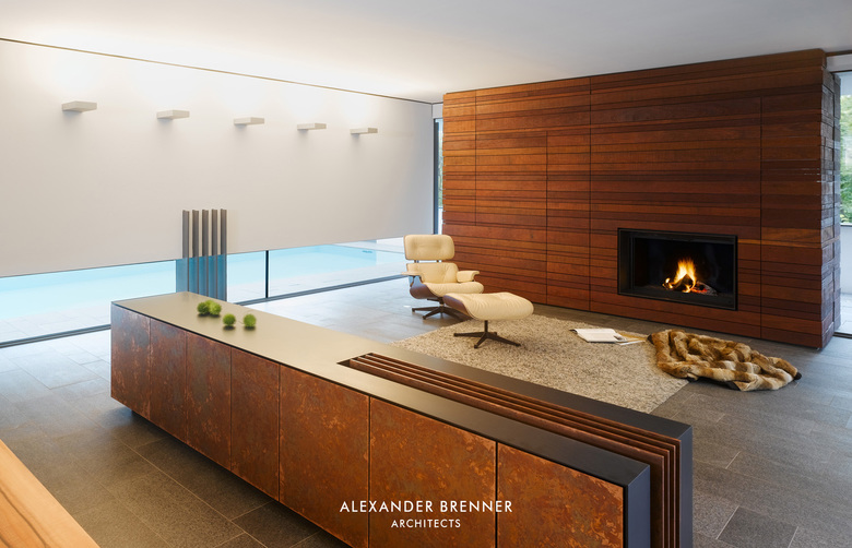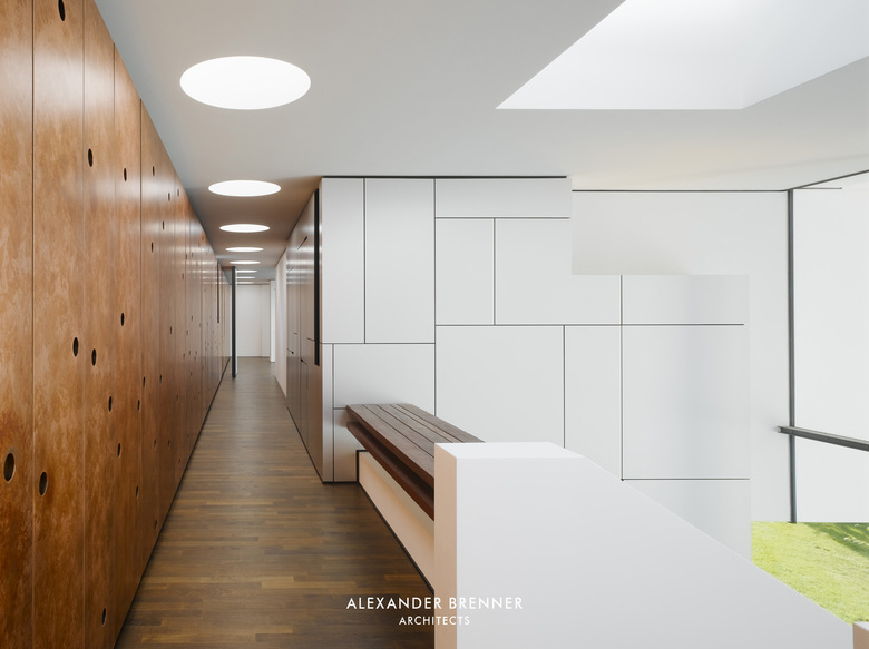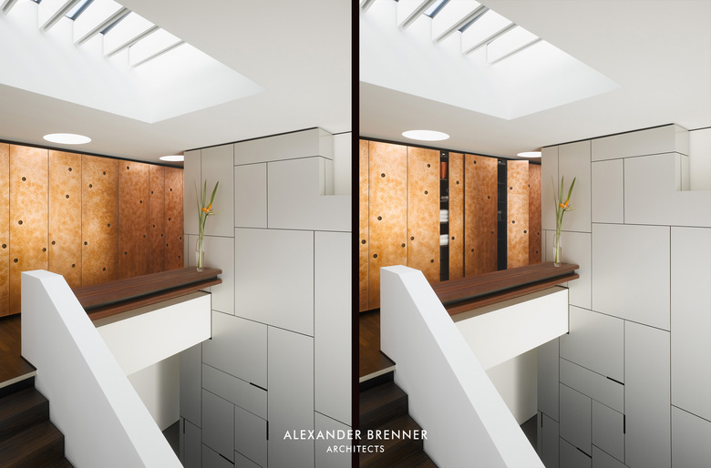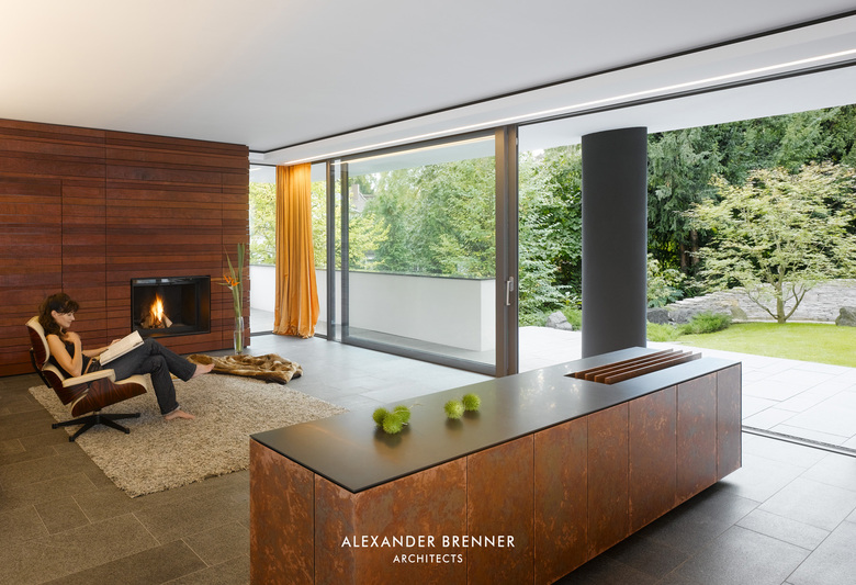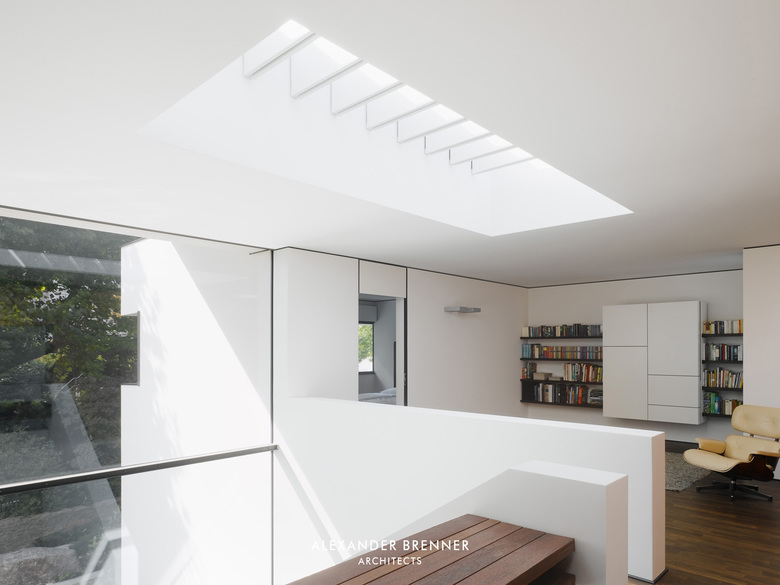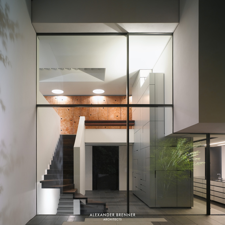 Die lichte Eingangshalle, über zwei Geschosse rahmenlos verglast, öffnet sich zum Garten mit der alten Platane. Alle Wohnräume sind auf diesen beherrschenden Baum hin ausgerichtet. Sowohl der Wohnbereich mit Essplatz und Küche im Erdgeschoss, als auch die Schlafräume, Bäder und der Dachgarten im Obergeschoss sind hierhin orientiert. Hier im Obergeschoss nimmt ein kupferbekleidetes Raumelement entlang der gesamten geschlossenen Nordwand alle zu lagernden und aufzubewahrenden Dinge und Funktionen auf. Dieses Element bildet das Rückgrat des Obergeschosses.