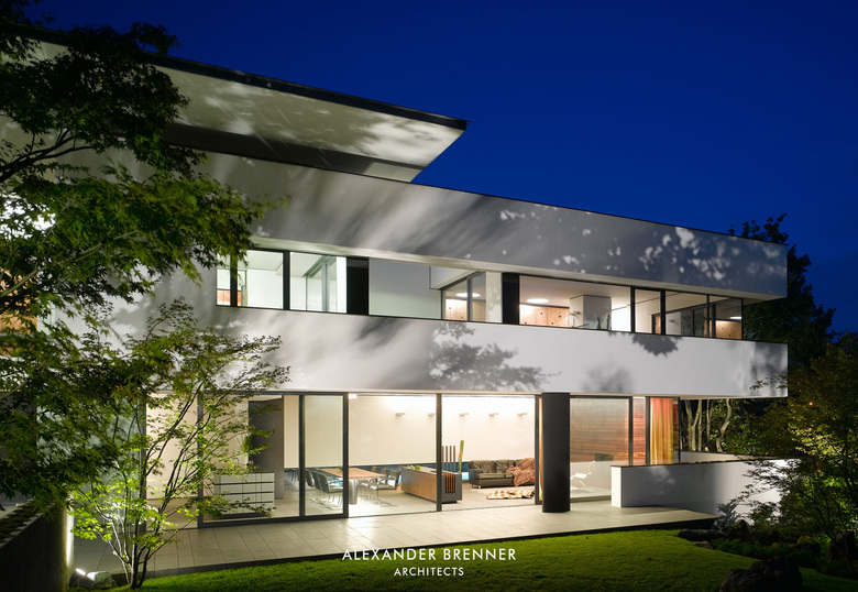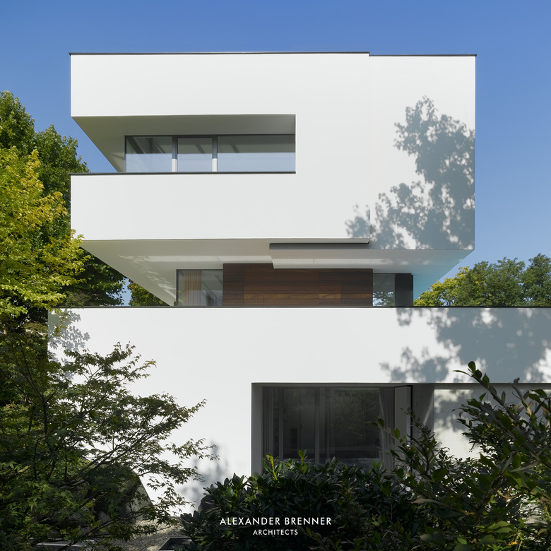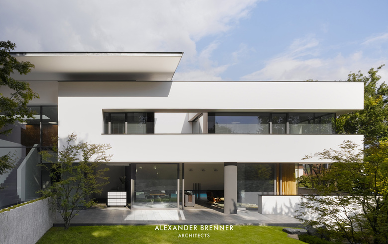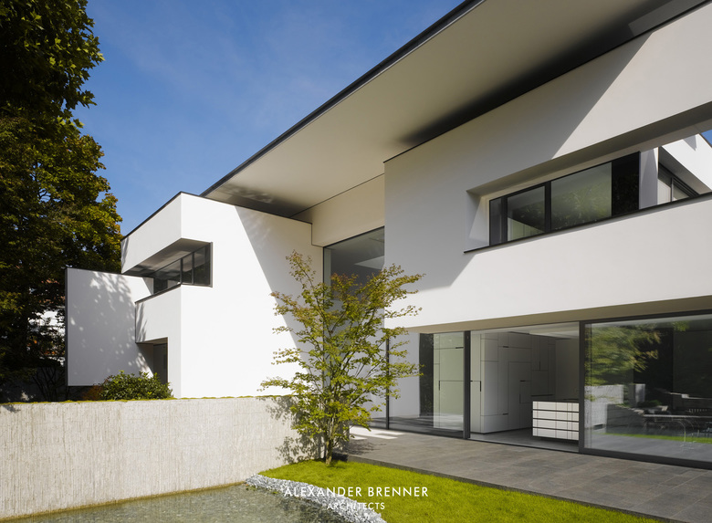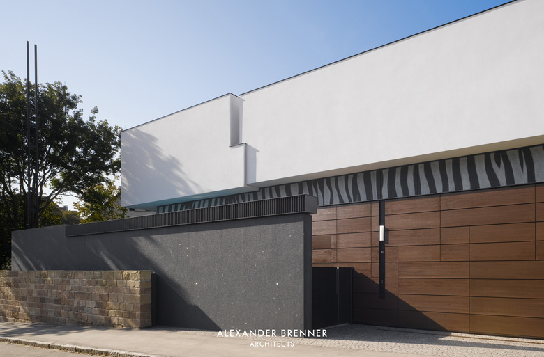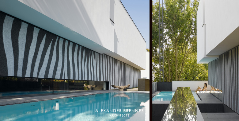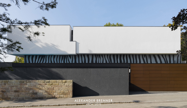 Der nahezu dreieckige Zuschnitt des Grundstücks mit einer langen Straßenseite und einer schützenswerten, mächtigen Platane im rückwärtigen Bereich führte zu einem gestreckten, straßenbegleitenden Baukörper. Die großflächig holzverkleidete Garagenwand, die vorgelagerten, hintereinander geschichteten Wände von Gartenmauer und Pool sowie der geschlossene, weiße Kubus, schwebend über einem „Zebrafell“, schirmen das Haus auf der Nordostseite zum öffentlichen Raum hin ab.