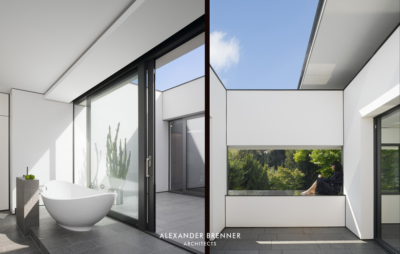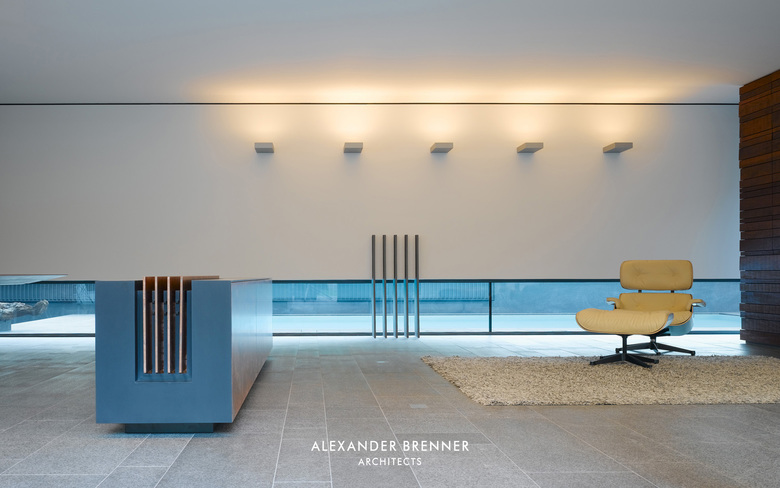 Über einen kleinen Hof und eine Freitreppe gelangt man zur Eingangsebene im Erdgeschoss. Von dort aus blickt man links auf den vor dem Haus liegenden Pool, der vom Straßenraum aus nicht einsehbar ist, aber von der frühen Morgensonne erreicht wird. Über ein bodengleiches Fensterband wird dieses Licht in den Wohnbereich reflektiert. Bei Dunkelheit erscheint vom Innenraum aus der beleuchtete Pool als abstraktes Bild.