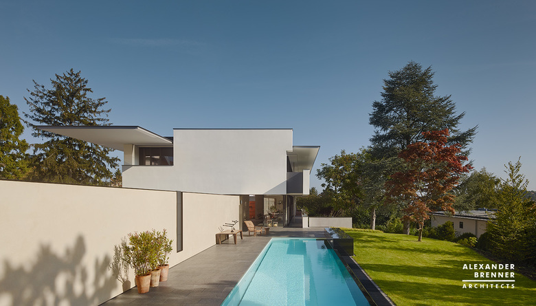 Der bis unter das Haus reichende, lang gestreckte Baukörper mit Garagen und Nebenräumen schirmt den Garten zum öffentlichen Raum hin ab. Das Haus öffnet sich mit allen Wohnräumen hangabwärts zum südlich gelegenen Wald.