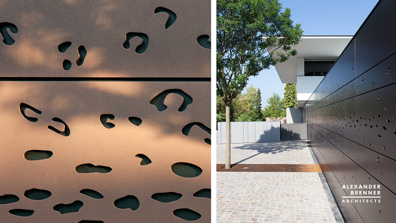 Zur Straßenseite hin sind vor allem im Obergeschoss Nebenräume und Bereiche angeordnet, die keine Fenster benötigen. Durch die Vor- und Rücksprünge, die auskragende Dachscheibe und die verschiedenen Oberflächen, die sich bis in die Außenanlagen fortsetzen, entsteht für den Stadtnutzer ein differenziertes, tiefes und kraftvolles Bild.