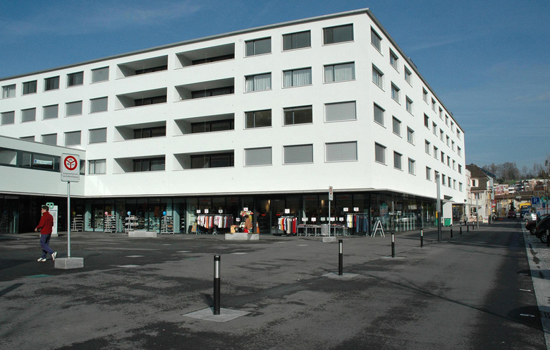 Die Zentrumsüberbauung Ost liegt zwischen der neu gestalteten Kantonsstrasse und dem Dorfbach. Das bestehende strassenseitige Gebäude wurde umgebaut und mit einem zweigeschossigen Zwischentrakt erweitert. In Kombination mit einem fünfgeschossigen, abgewinkelten Neubau ist ein neuer Dorfplatz entstanden, als prägendes städtebauliches Element und Treffpunkt in der neuen Zentrumszone. Ihre eigene Identität verdankt die Überbauung einer zurückhaltenden Architektursprache mit einheitlichen Fensterformaten und Balkonloggien. Für Kontraste sorgen die farblich zu den verschiedenen Gebäudekörper abgestuften, verputzten Fassaden mit den Gewänden und das verglaste Sockelgeschoss.