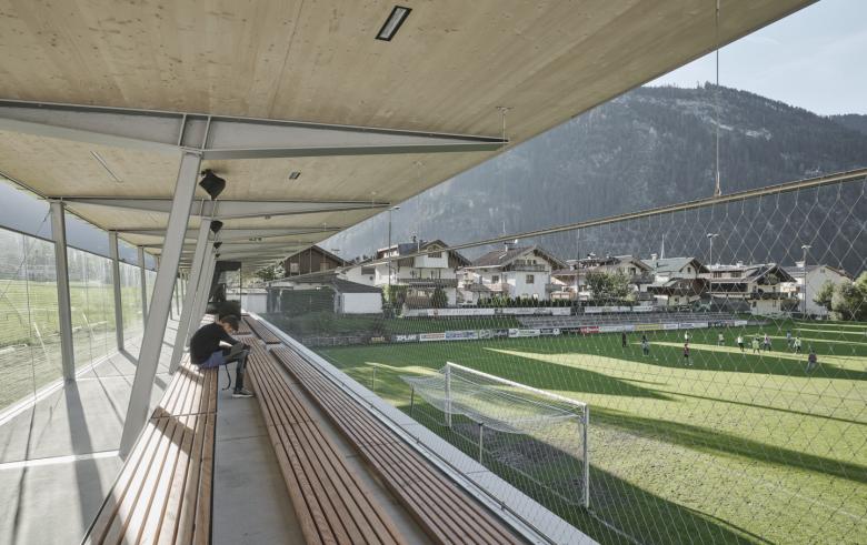 Es handelt sich um einen Trakt mit Sportgarderoben und darauf befindlicher Zuschauertribüne mit Flugdach sowie einem Hochbau mit Vereinsraum und Kantine. Während der Flachbau des Garderobentrakts durch Ausnützung der Topografie nur vom Fussballplatz aus in Erscheinung tritt ist der Hochbau an der Straßenseite bewusst sichtbar und adressbildend situiert. Unterstützt wird dieser Gedanke durch das Flugdach, das leicht und schwebend die Zuseher auf der Tribüne schützt.