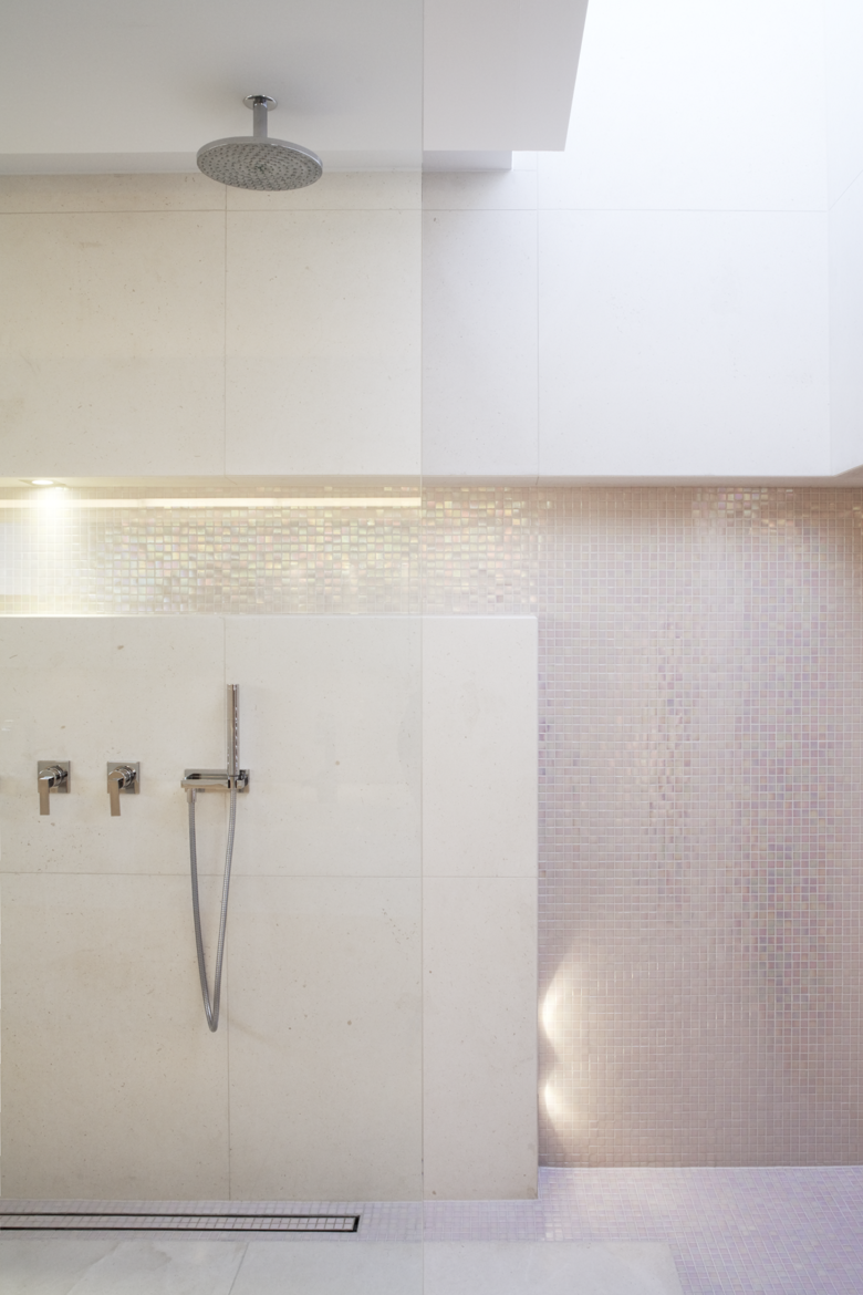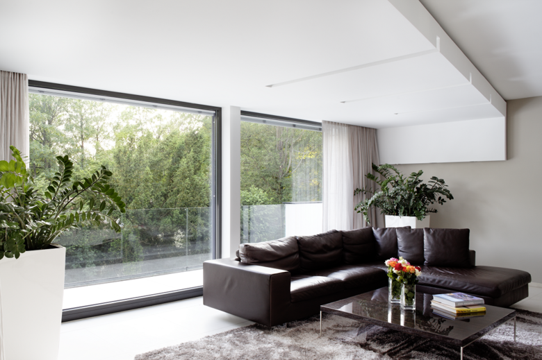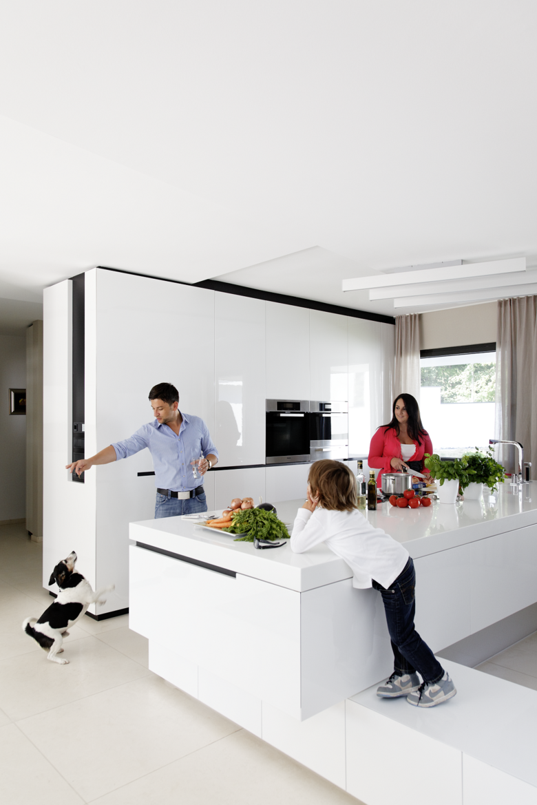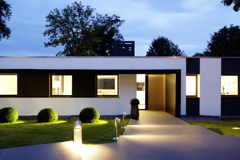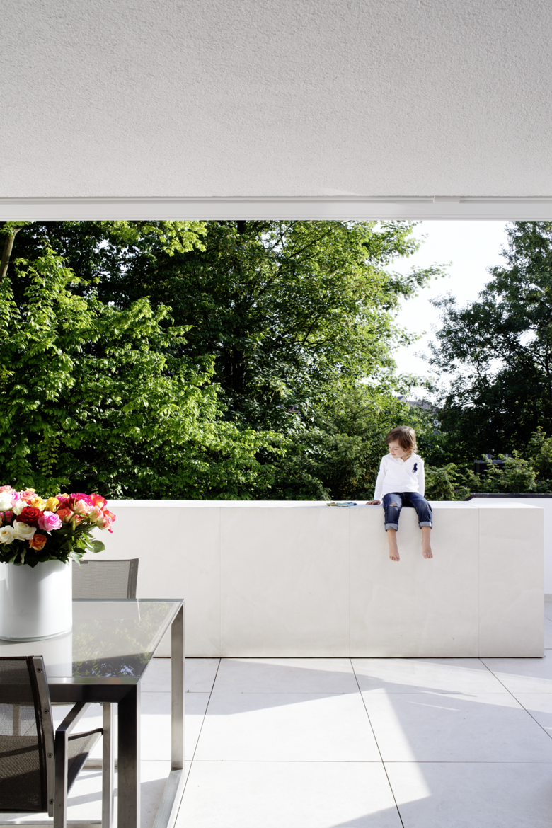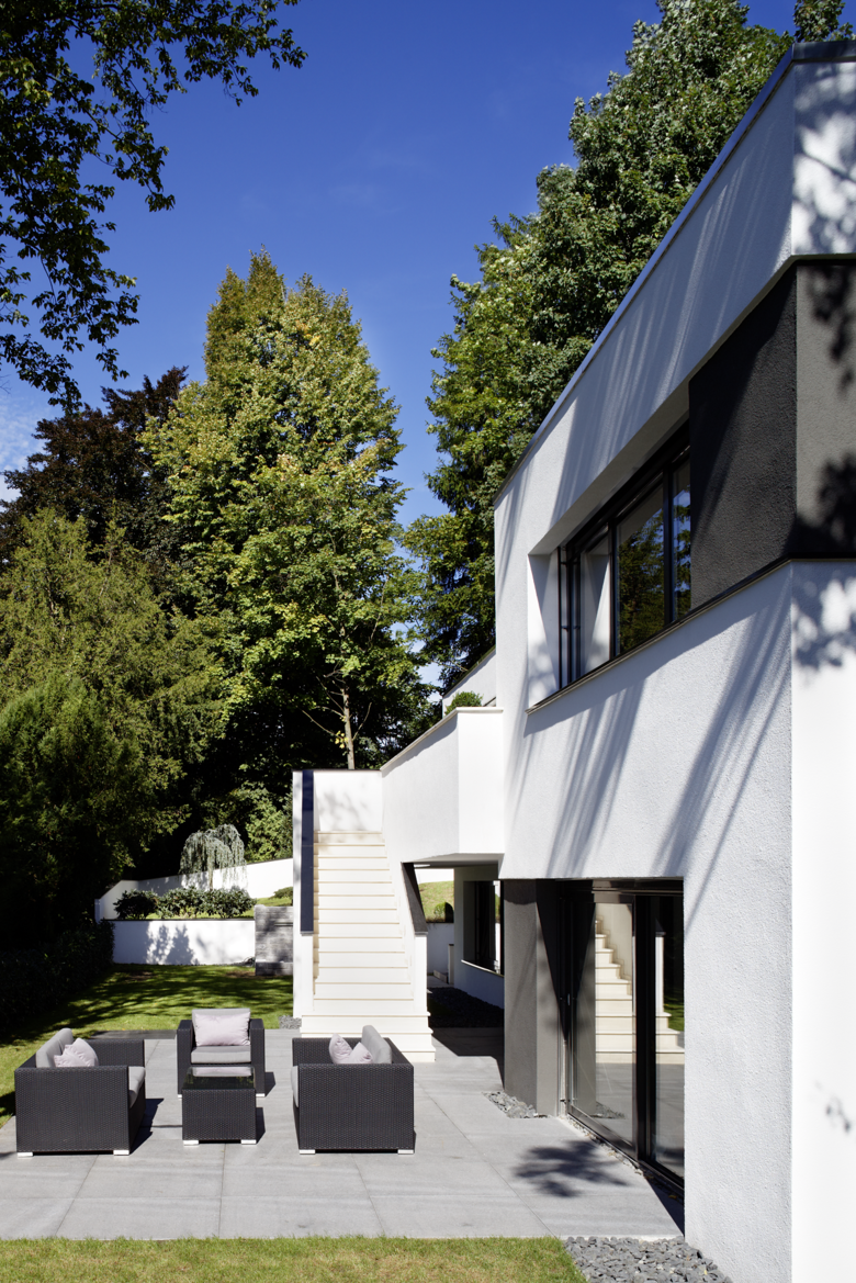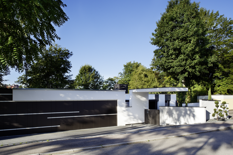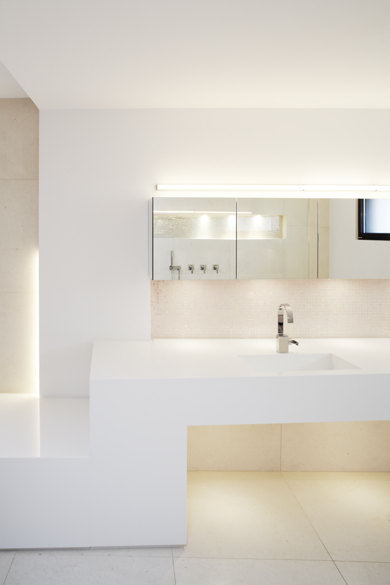 In den siebziger Jahren erbaut, wurde der an den Stuttgarter Weinbergen stehende Bungalow in ein Einfamilienhaus mit großen, hellen Räumen umgewandelt. Die Funktionen verteilen sich auf zwei Geschosse. Auf der Eingangsebene wurden drei Bereiche geschaffen: ein öffentlicher mit dem Büro, ein halböffentlicher mit Wohnen, Essen und Kochen sowie ein privater, in dem die Schlafräume sowie das Bad untergebracht sind. Das Untergeschoss wiederum beherbergt den Wellnessbereich, eine Gästewohnung und die Kellerräume. Um die drei Zonen im ersten Geschoss zu schaffen und die Kleinteiligkeit der bestehenden Räume aufzuheben wurden tragende Wände aufgebrochen. Ein durchgängiges Konzept von Wand- und Bodenbelägen sowie abgehängten Decken und Raum- beziehungsweise Möbeleinbauten verbindet die Bereiche miteinander. Alle Maßanfertigungen wurden nach Entwürfen des Architekturbüros ausgeführt.