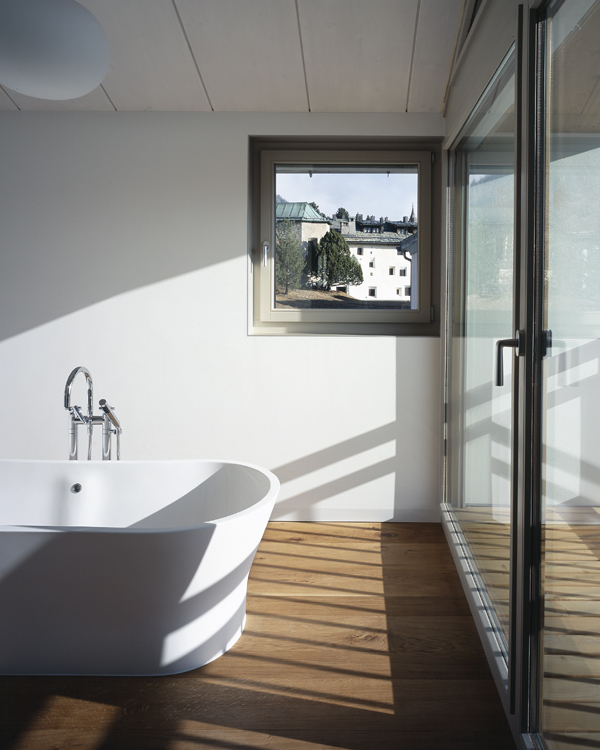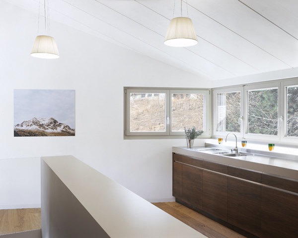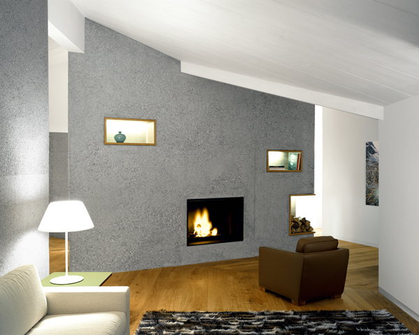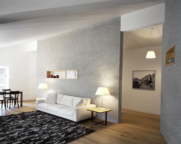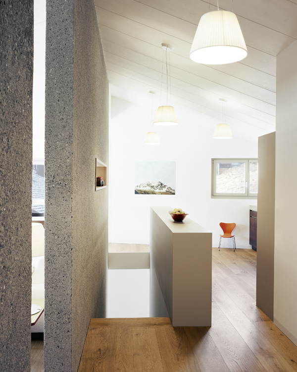 Zwei übereinander liegende Wohnungen mussten verbunden und in ein stimmungsvolles Ganzes verwandelt werden. Anstelle der ursprünglich kleinen Räume entstand ein offener Grundriss mit spannenden Durchblicken. Das Herzstück und verbindende Element der beiden Etagen ist ein Mauerkörper aus gestocktem Beton mit Kies aus dem Bergell, der die Bergwelt im Inneren erlebbar macht. Darin eingelassen sind Cheminée, Garderobe und Nischen, die als praktische Ablageflächen oder als Schaukästen für ‹Objets trouvés› dienen. Der Auftrag umfasste alles von der Raumanordnung über die Auswahl der Materialien bis hin zur Einrichtung und Ausstattung.