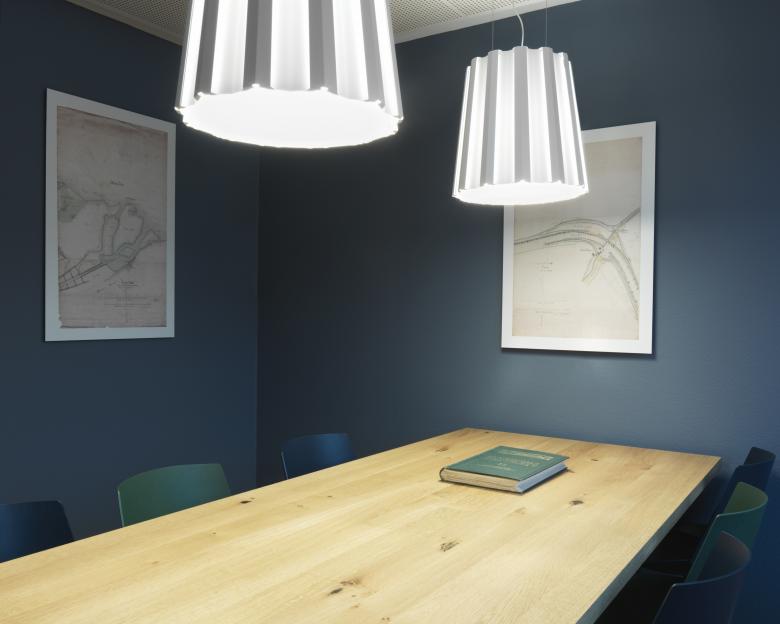 Die Geschichte des Linthkanals und die Pionierarbeit des Hans Konrad Eschers sind überall präsent in den Räumlichkeiten der Linthverwaltung, die historischen Bilder an den Wänden sind Zeitzeugen davon. Die Farben der Wände nehmen Bezug darauf und erzählen die Geschichte weiter: Im Entrée bildet ein warmer Braunton, der das Thema Landschaft aufnimmt, den Hintergrund für das Sidelhorn-Panorama. Das Blau des Sitzungszimmers versinnbildlicht das Wasser des Linthkanals. Farben, Leuchten und Möblierung sind aufeinander abgestimmt. Zum Umbaukonzept gehören auch eine Akustikdecke, ein neuer Parkettboden und die Erneuerung der elektrischen Installation.