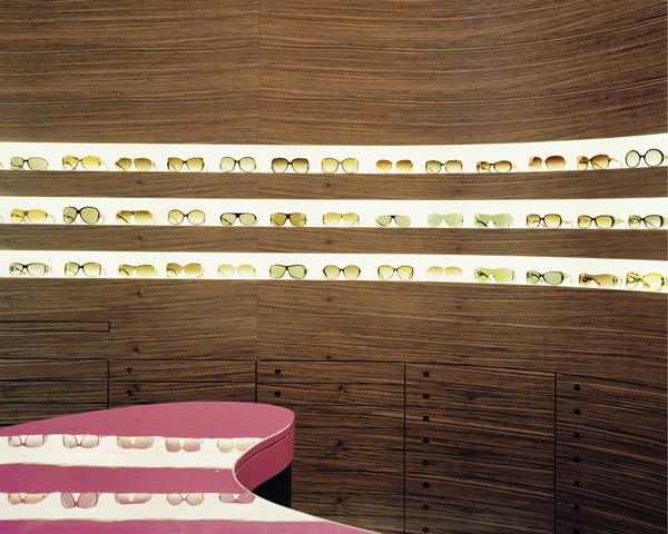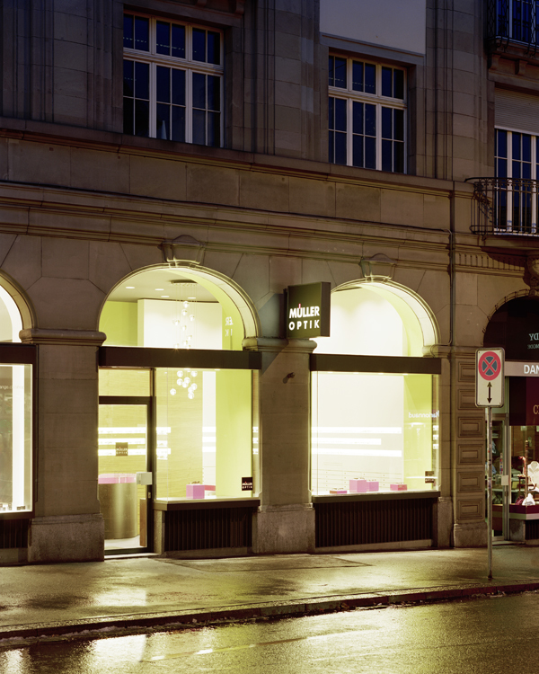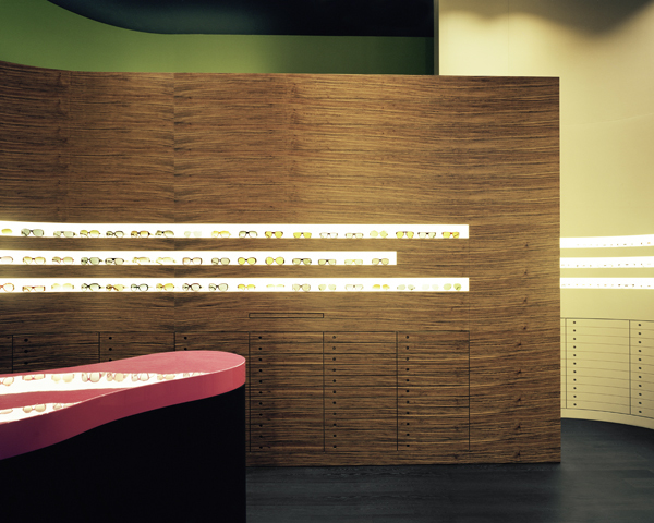 Das Optiker-Geschäft Müller weist eine kleine Verkaufsfläche auf, umso entscheidender für seine Nutzung war eine geschickte Aufteilung des Raumes. Zwei abgerundete Wandelemente sind so zueinander positioniert, dass sie davor einen Verkaufs- und dahinter einen Untersuchungsbereich ermöglichen. Dennoch bleibt der Raum als Ganzes erlebbar. Mit den Oberflächen in Holz und Naturtönen entsteht eine warme Farbstimmung und eine wohnliche Atmosphäre. Die Verkaufstheken in Nierenform bilden dazu einen farblichen Kontrast: In glänzendem Pink gehalten, scheinen sie wie kleine Wolken im Verkaufsraum zu schweben.