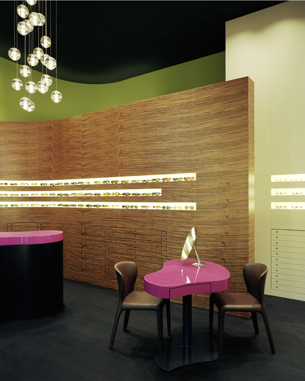 Verkaufsraum mit Brillenwand in Ovangkol und farbigen Beratungstischchen