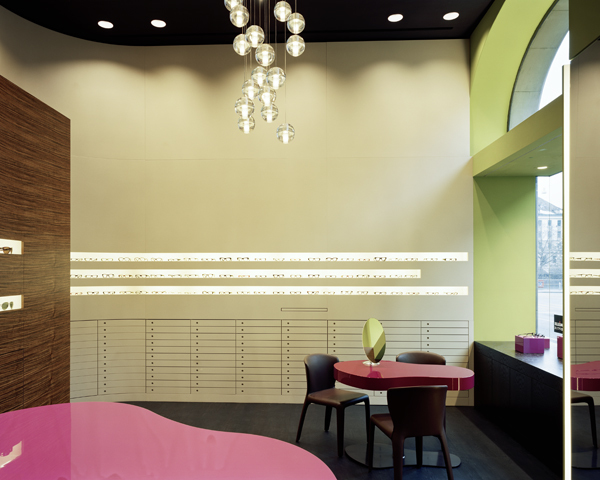 Verkaufsraum mit pinkfarbenen Beratungstischen und Brillenwand im Hintergrund