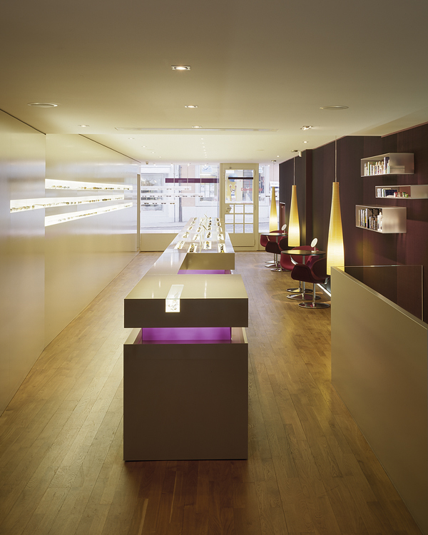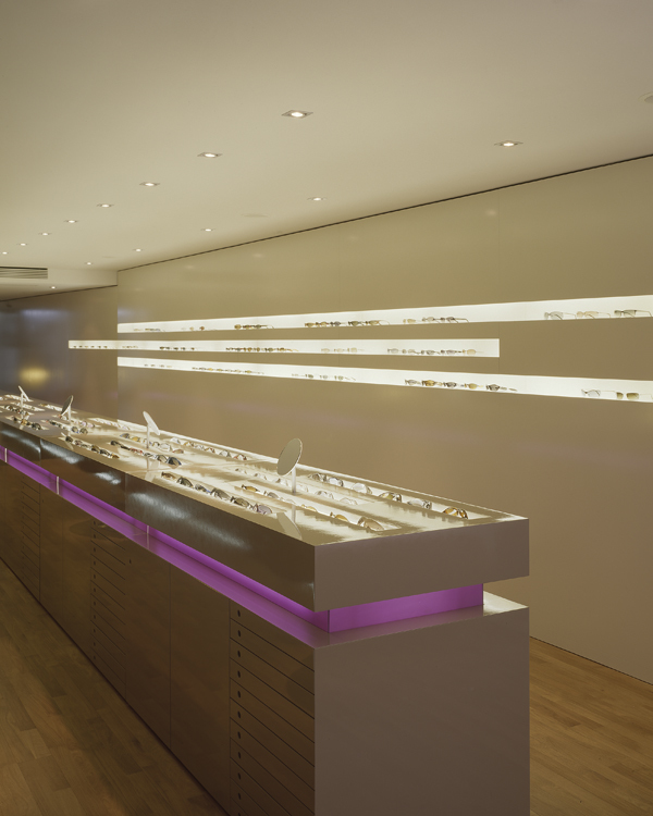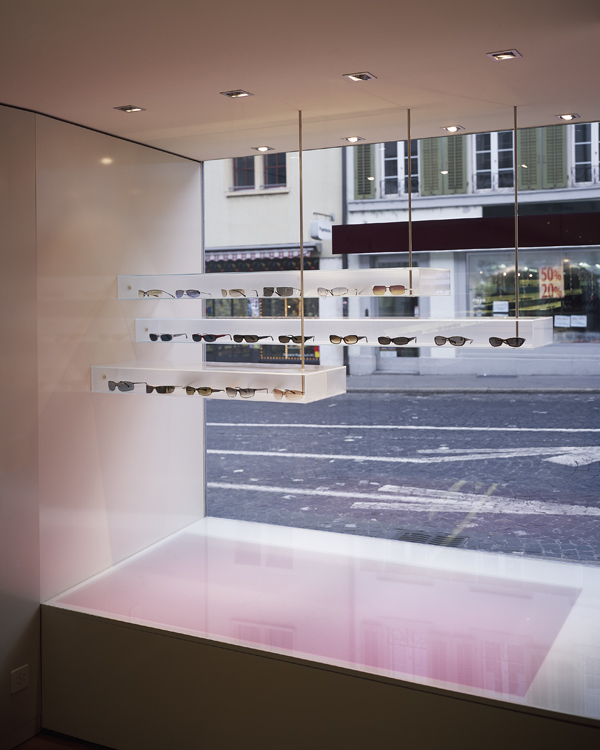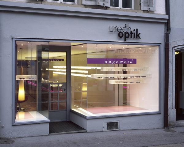 Der Verkaufsraum für Sonnenbrillen ‹augeweid› ist Teil des Optikergeschäfts Urech, in der Vorstadt von Aarau gelegen. Der Raum spielt mit Material, Oberflächenbeschaffenheit, Farbe und Licht. Die beiden Längswände, einmal in beigem Schleiflack ausgeführt und gegenüber mit dunkelrotem Stoff bespannt, bilden einen Gegensatz und sind dennoch aufeinander abgestimmt. Mit Schubladen und Auslagen vielseitig nutzbar, unterteilt ein langgezogener Verkaufskorpus den Raum in zwei Zonen. Er erhält durch ein Lichtband in Pink einen farbigen Akzent. Seitlich sind drei stimmungsvolle Leuchten auf Augenhöhe aufgehängt und bilden dazwischen die Beratungsnischen.