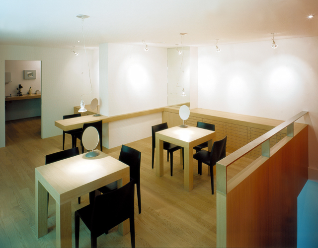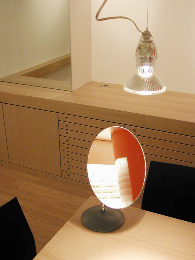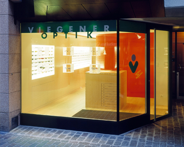 Das Ladenlokal von Optik Viegener ist ein schmaler, langer Raum in einem 70er-Jahre-Haus, im Zentrum St. Gallens gelegen. Ein externes Treppenhaus ragt als abgerundeter Baukörper mitten in den Verkaufsraum hinein und trennt den Eingangsbereich vom dahinter liegenden Beratungsraum ab. Mit Leuchtschaukästen für die Brillen ausgestattet, ist die über die ganze Längsseite verlaufende Ausstellungswand ganz in Hochglanz ausgeführt, sie lenkt die Kundschaft in den hinteren Bereich. Der Boden und die Verkaufstheken sind in Eichenholz gefertigt, im Gegensatz dazu leuchtet das dominante Volumen des Treppenhauses in glänzendem Porsche-orange-1968.