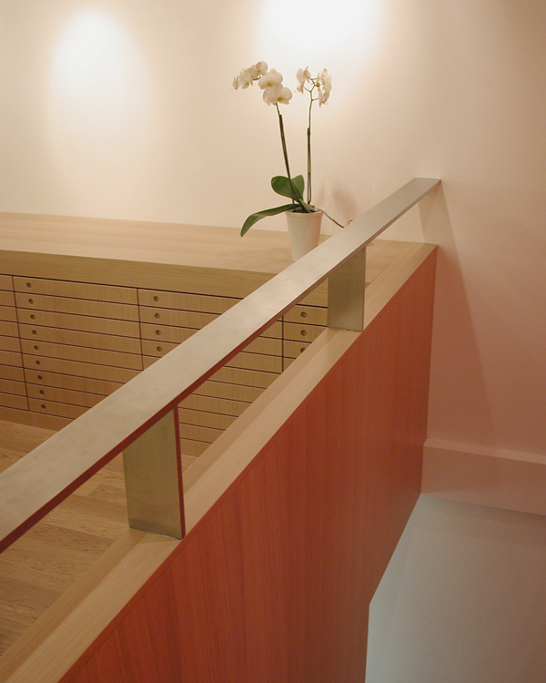 Verkaufskorpus in Eiche und Brillenwand in Schleiflack vor orangefarbenem Treppenhaus