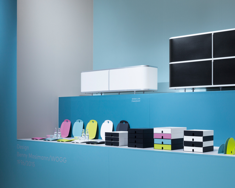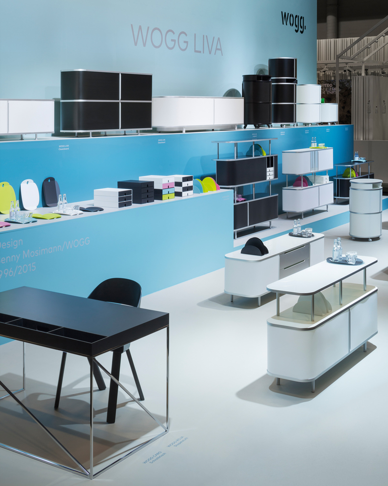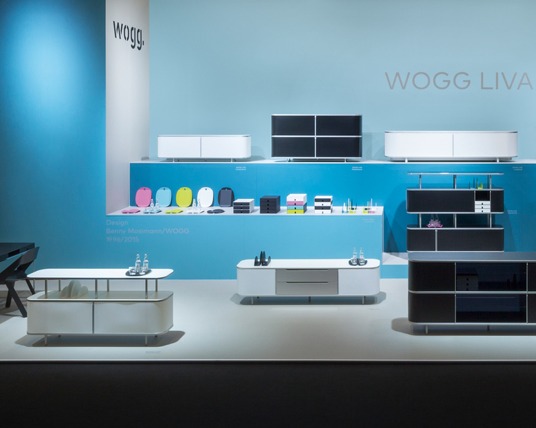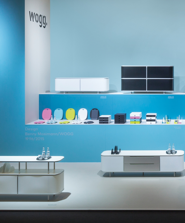 Als Präsentationsfläche für die Möbel der Produktfamilie Wogg Liva dient ein in Tiefe und Höhe abgestufter Wandkörper. Er verläuft über die ganze Länge des Standes und ist gleichzeitig Rückgrat und Anziehungspunkt. Die einzelnen Ebenen sind in der Tiefe aufgrund der unterschiedlichen Blautöne einfach erkennbar. Unterschiedlich hoch sind auch die Podeste, deren Schnittflächen sind, wie der Boden, ganz in hellgrau gehalten. Es entsteht eine Bühne, auf der die Möbel als Hauptakteure selbstbewusst auftreten können. Und mehr noch, die gestaffelte Bühne bietet jederzeit auch einen Überblick über die ganze Möbelfamilie.
