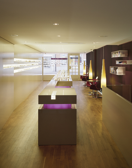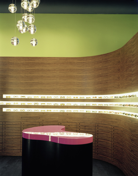 Mit seinem renovierten Ladenlokal stellt Müller Optik herkömmliche Sehgewohnheiten auf die Probe: Warme Naturtöne, starke Kontraste in Grün und Pink sowie runde Formen aller Art prägen das frische Interieur.