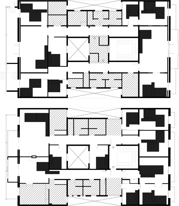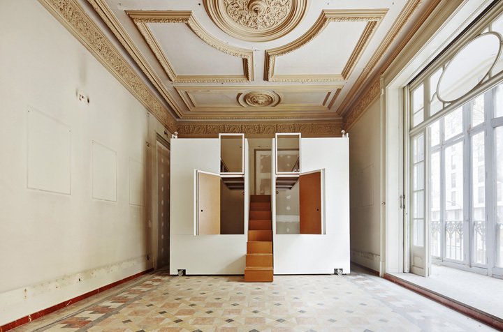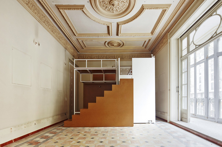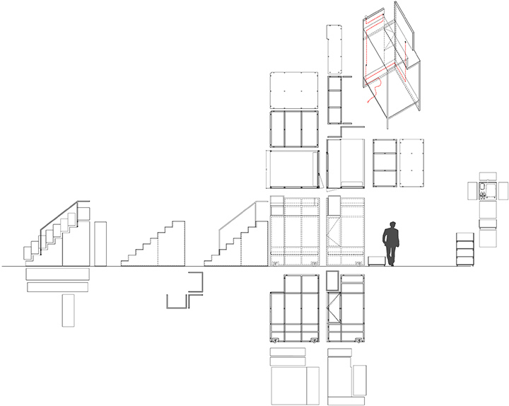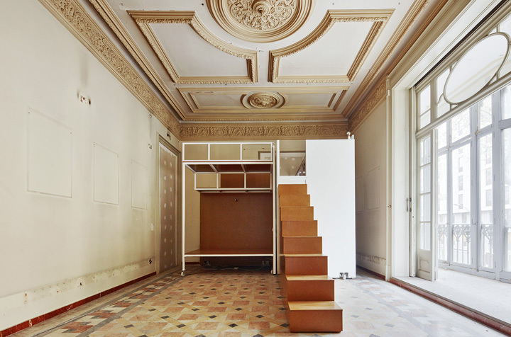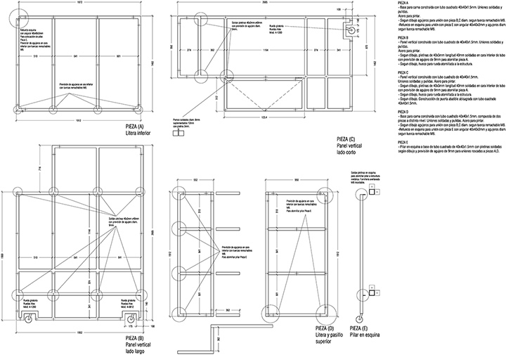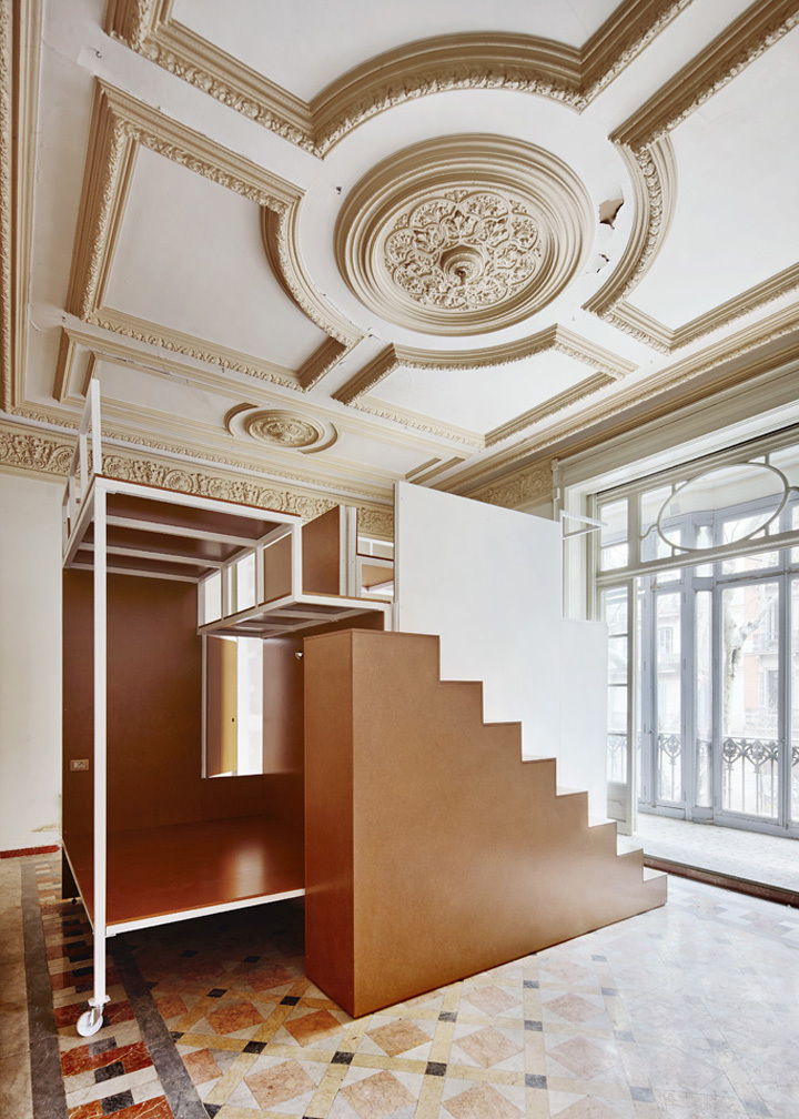 The commission was to tranform 4 dwellings of the same building into touristic apartments. The requirement to modify as less as possible the existing elements had an important influence to define the strategy which was focused in two aspects. Firstly, it came the desicion of where to locate both kitchens and bathrooms. They are all close to patios to get easier the existing sewage disposal. Secondly, the goal was to design a room module adaptable to each room of the apartment by different combinations. The modules are made in workshops and they include storage and beds as well as electric and lighting systems. The images show the first prototype in its place.