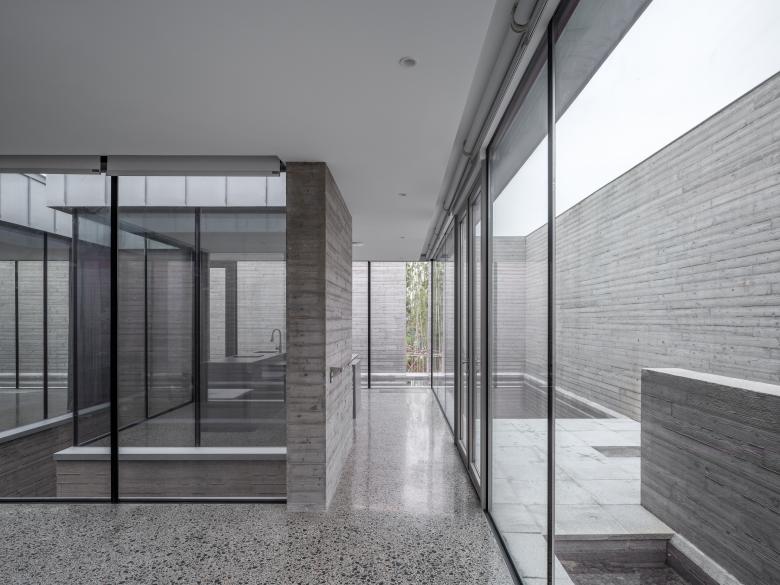 The space in the upper floor glass house is simultaneously open and divided. The inhabitant may move along the outer glass curtain wall enjoying a panoramic view of the surrounding water court, which is only punctured by the sceneries through the cuts in the peripheral wall.