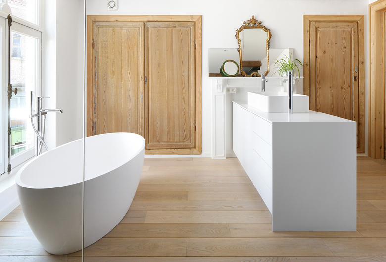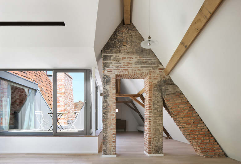 Two disused 17th-century houses on a protected brewery site in the centre of Bruges were rebuilt into a family home (with retail and storage space). The structure was opened up to connect all the spaces on both floors of both houses.