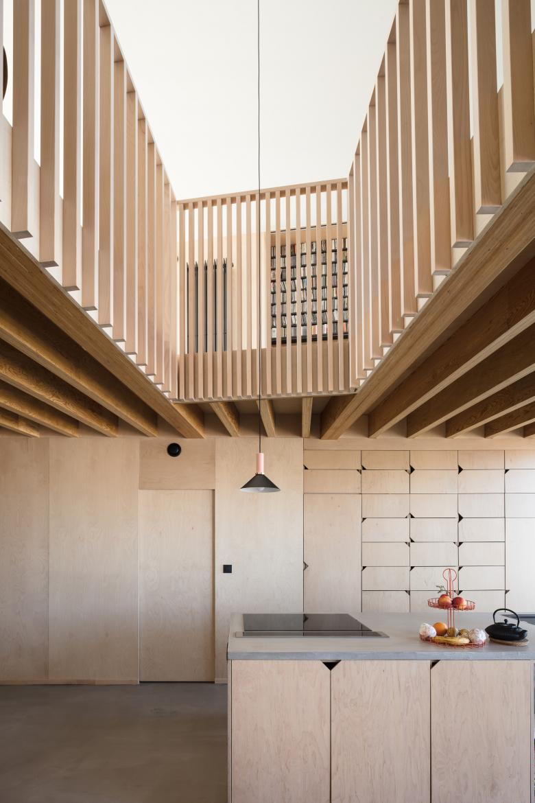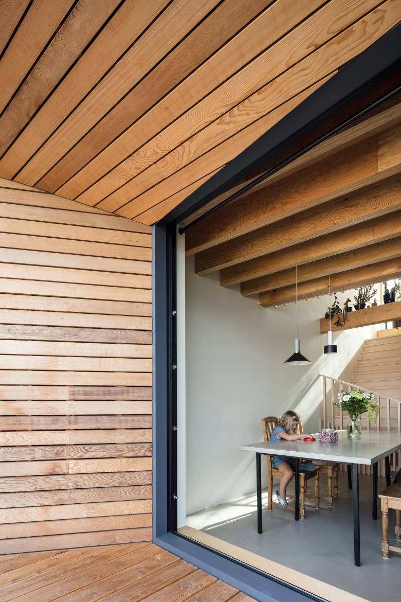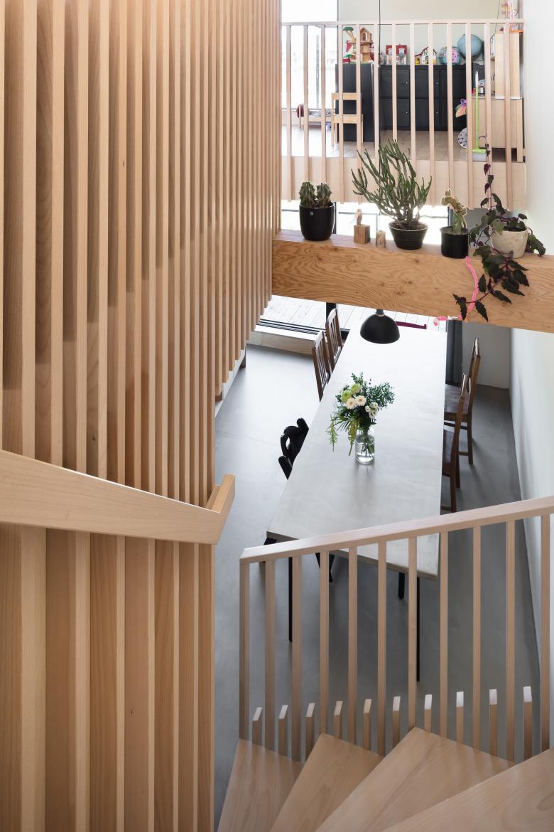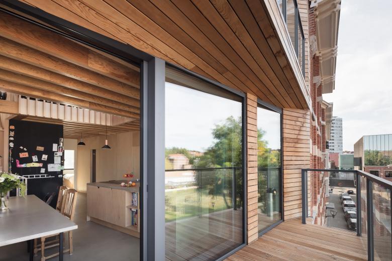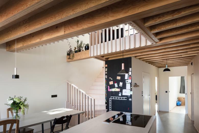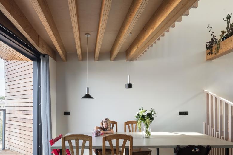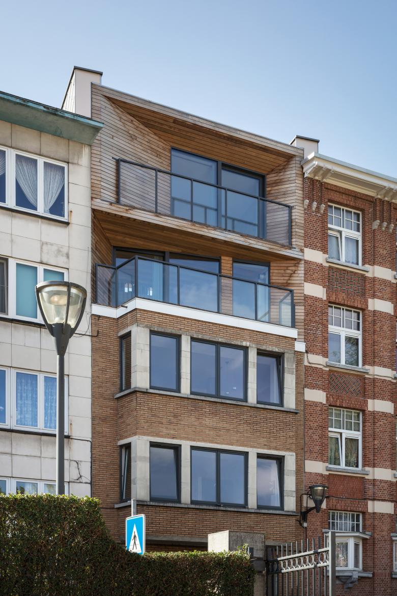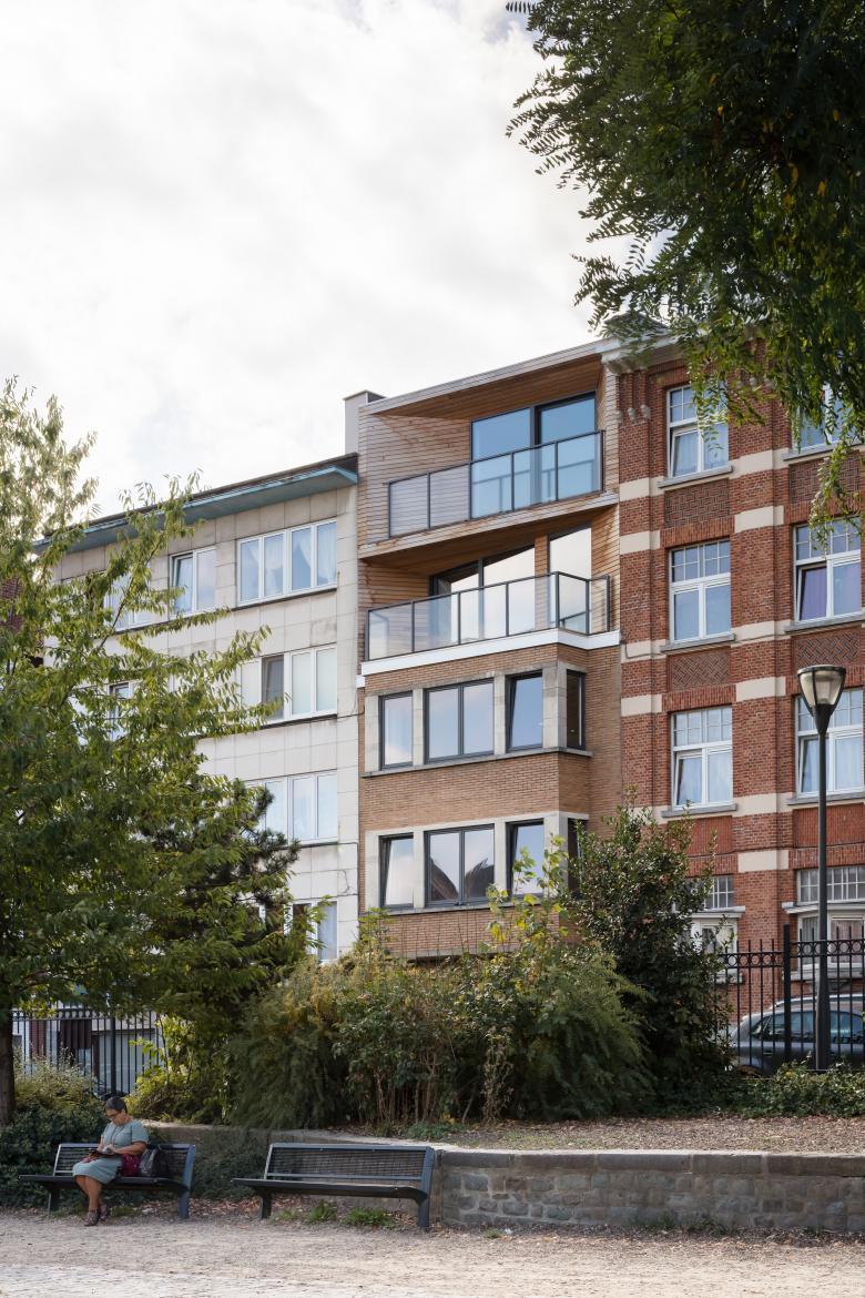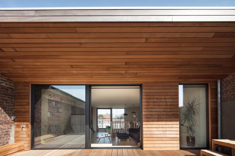 This compact but spacious home in the dense urban fabric was obtained by transforming an unused attic into a passive duplex penthouse. Recessed façades on the street side create terraces overlooking the park. The third terrace at the backis the ideal spot in which to enjoy some sun. The void and staircase let the sunlight reach the lower floor. Wood was chosen as a light and environment-conscious material.