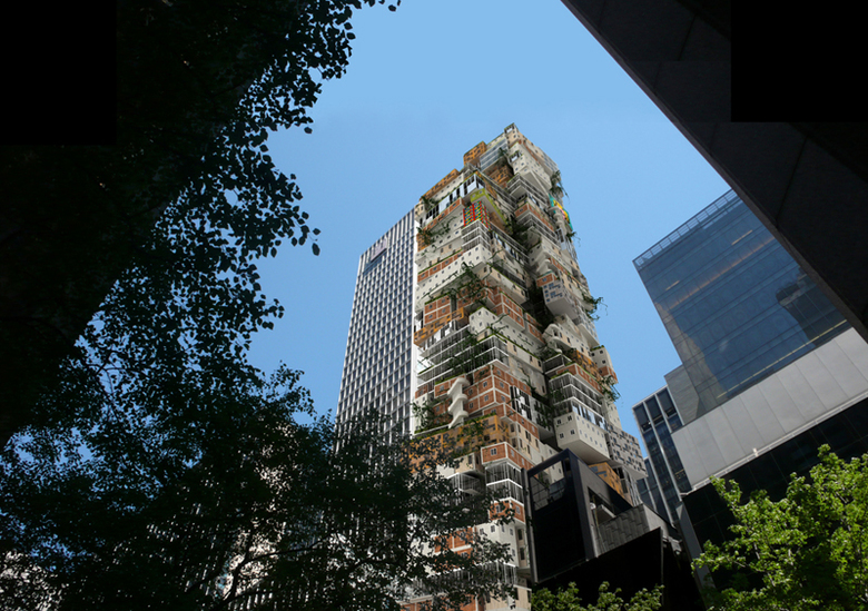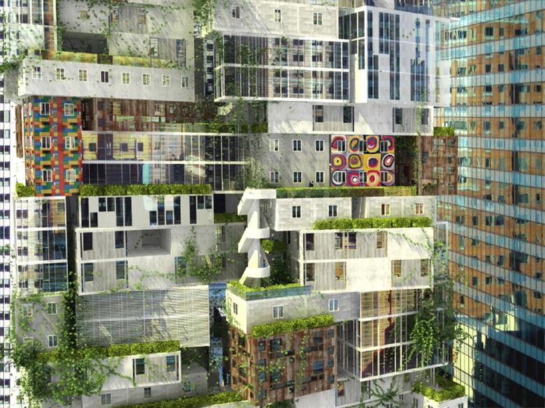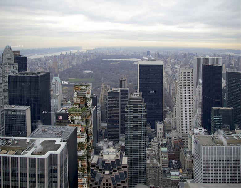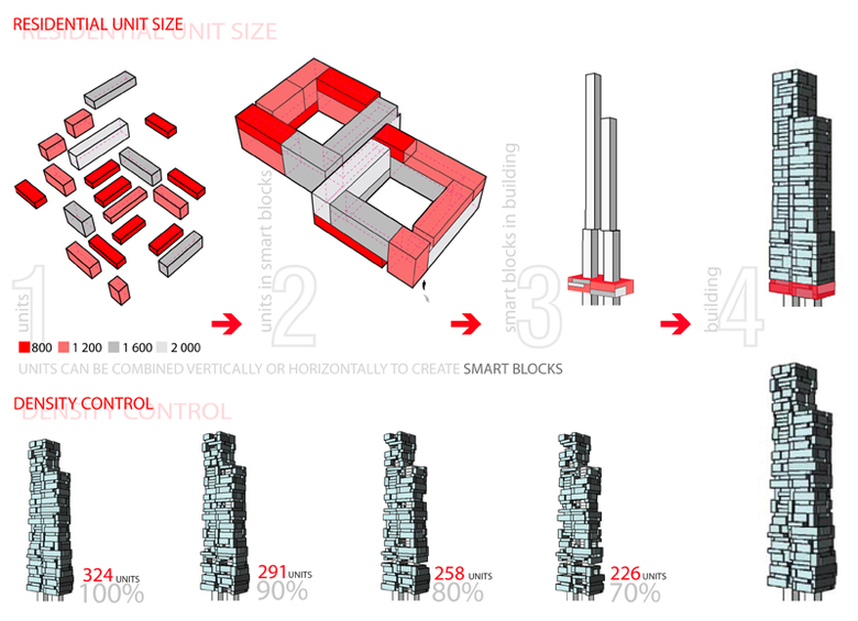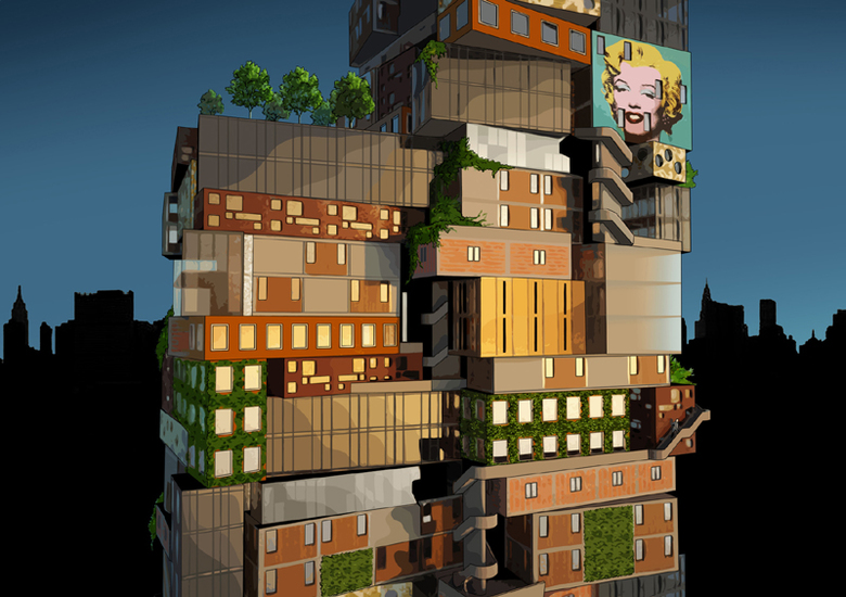In a city as diverse as New York—where over 300 languages are spoken amongst countless cultures and nationalities—it’s puzzling to find skyscrapers formatted in cookie-cutter, one-style-fits-all fashion. This proposal presents a radically different conceptual alternative. Taking inspiration from randomly piled Brazilian favelas and Italian hill towns, the design offers a more accommodating flexibility for individual expression. Unit modules of 800 to 2,000 square feet, called “SmartBlocks,” are assembled like pieces in a three-dimensional vertical puzzle around two cores that run the full height of double towers. Each SmartBlock has a different exterior treatment based on a handful of iconic architectural styles, giving the irregularly stacked façade the appearance of a crazy-quilt vertical neighborhood. This alternative reframes the conversation around building tall while reflecting the heterogeneous reality of a great city. It represents a dynamic urbanism of difference, more visually alive than the glass-and-steel monotony of most city towers.