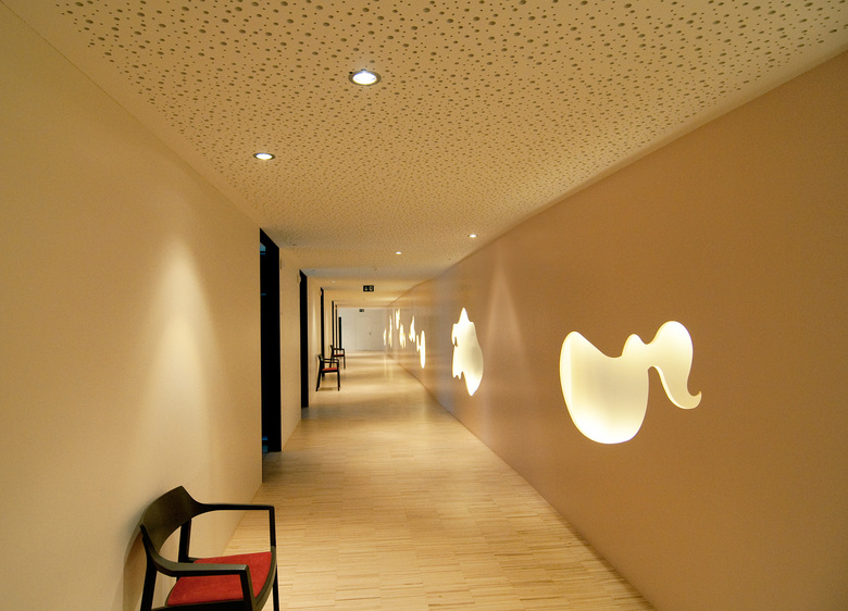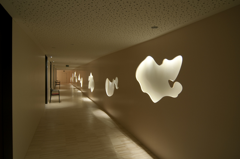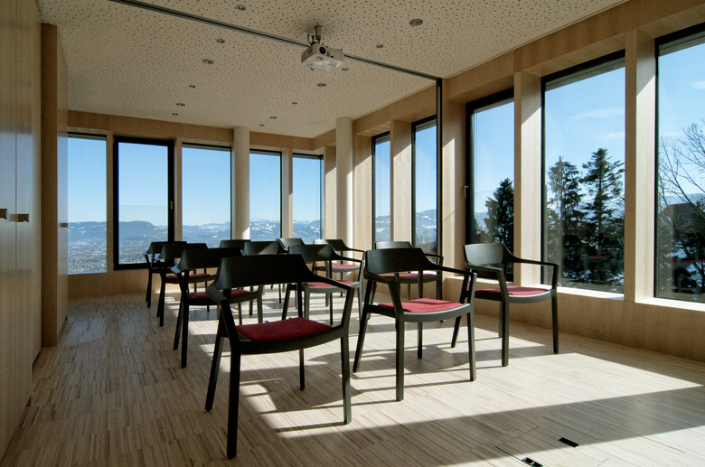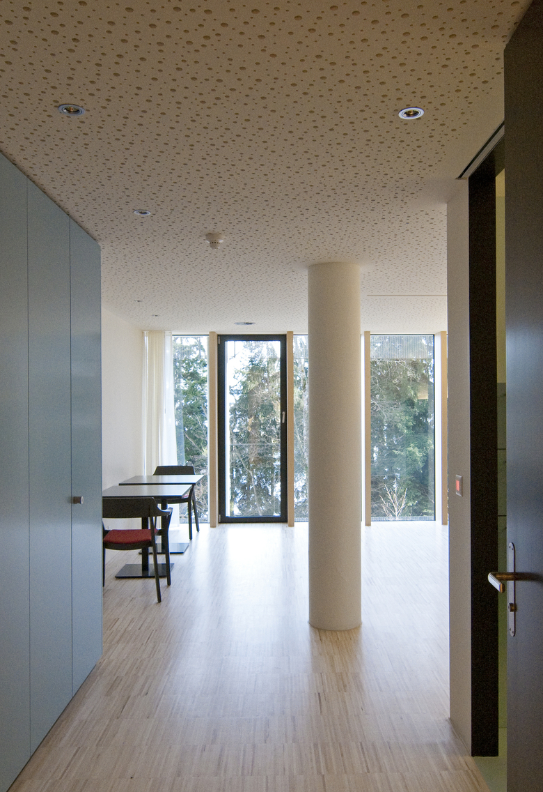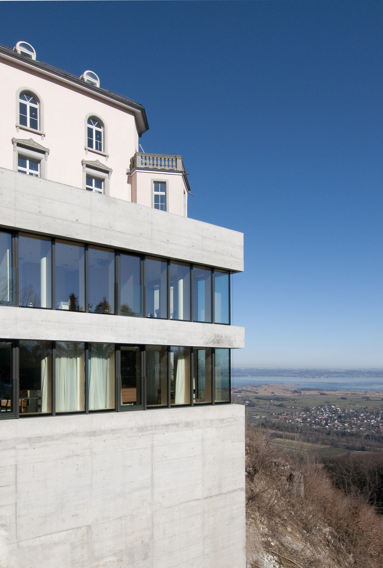 Für die private neurologische und orthopädische Rehabilitationsklinik wurde ein bestehendes Parkdeck zu einer neuen Bettenstation mit hellen Patientenzimmern und Sicht auf den Bodensee umgebaut. Zusätzlich entstand ein moderner Verbindungsbau aus Sichtbeton und Glas mit Erschliessung, Besprechungsräumen und Patientenzimmer. Für die immer schwerer beeinträchtigten Patienten wurden der Plege und Therapie angepasste Raumverhältnisse geschaffen.