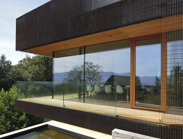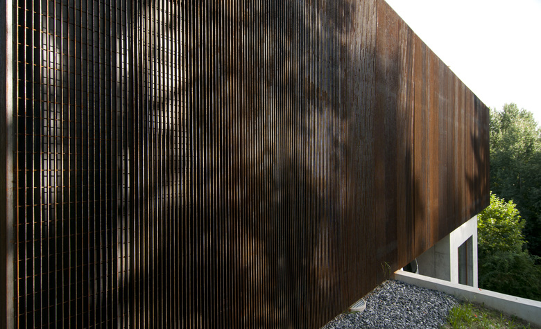 Generell lieget die Faszination der Fassade im Wechsel von Transparenz und Geschlossenheit. Je nach Position und Lichtsituation erscheint die Fassade flächig oder durchsichtig, hellorange oder schwarzbraun. Für dieses Schauspiel bildet der Wald die perfekte Kulisse.