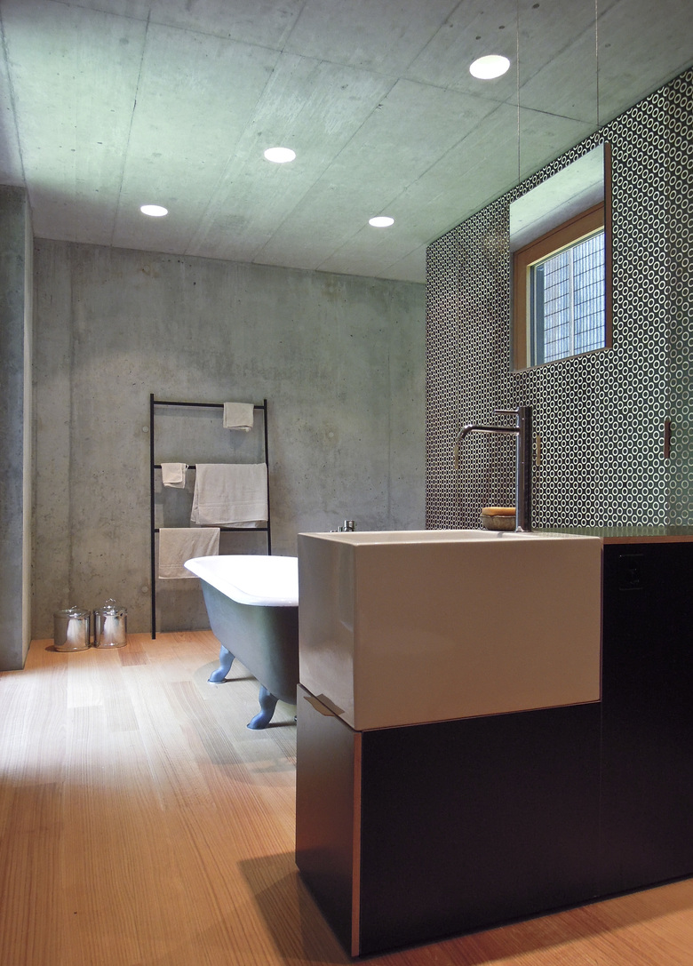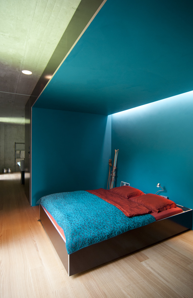 Vier Treppentritte unterhalb der Zufahrtsebene bietet der hohe schmale Raum des Ateliers den gerahmten Blick ins Tal und in den Wald des Tobels. Die Besprechungsnische mit WC und Teeküche setzt sich durch eine geringere Raumhöhe ab. Der rohe Anhydridboden, die Tiefe der hellen mineralischen Wandfarbe und die Rottöne der Douglasie verleihen dem Arbeitsraum eine angenehme Leichtigkeit.