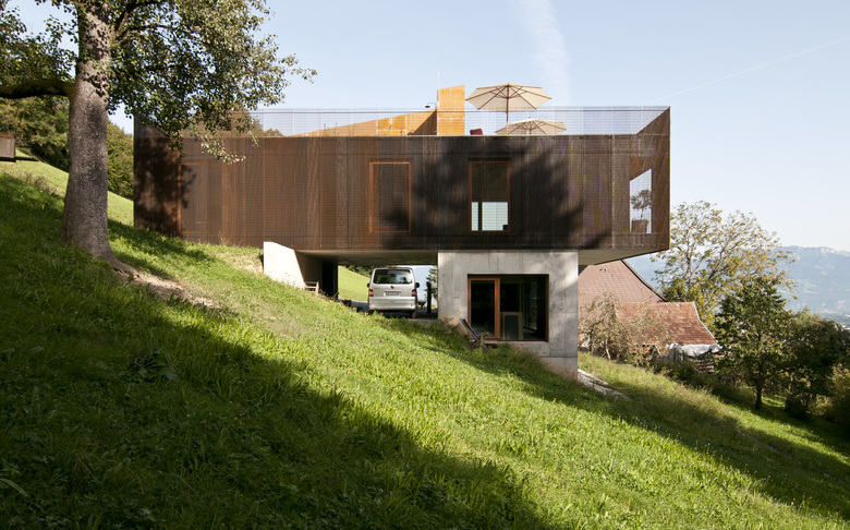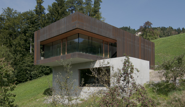Das Wohnhaus mit Atelier steht im Rüden, einem höher gelegenen Ortsteil der Gemeinde Berneck im St.Galler Rheintal. Die Umgebung ist ländlich. Das Hanggrundstück grenzt im Westen an ein bewaldetes Tobel und bietet im Südosten einen fantastischen Blick auf Natur, Berge und Tal. Abgestimmt auf Topografie und Aussicht wurden zwei Quader in den Hang gelegt. Der untere Atelierquader aus Beton liegt quer und ist Auflager für den in Hangrichtung auskragenden Wohnquader, welcher von oxidierenden Stahllamellenrosten umgeben ist. Der Hangcharakter der Parzelle wurde weitgehend belassen, einzig die Zufahrt bildet eine Erschliessungsebene, welche vom Wohnkörper überspannt wird. Alle Volumen und Nutzungen sind in einer Erschliessungsachse über Treppen miteinander verbunden.
