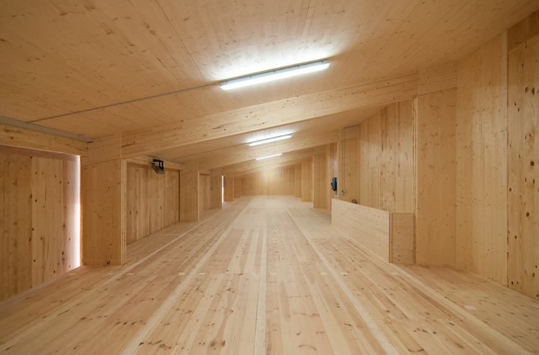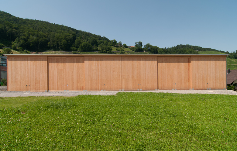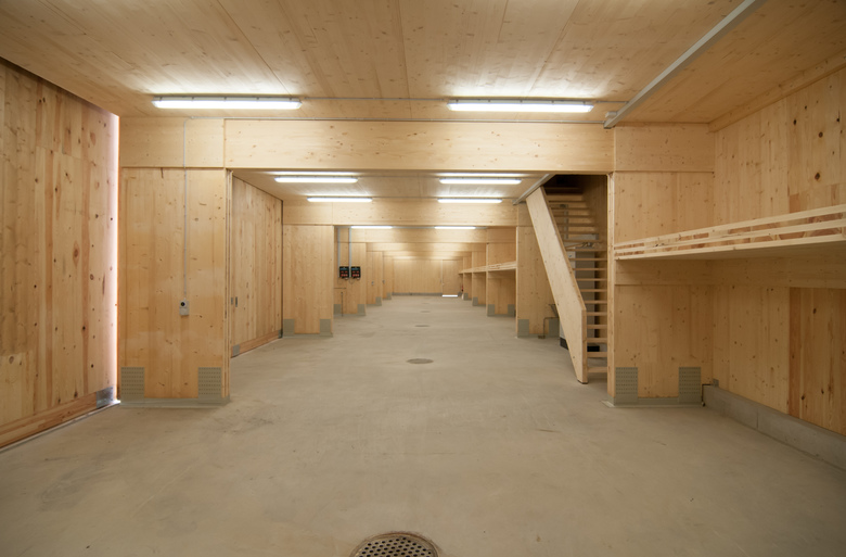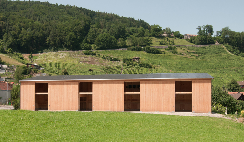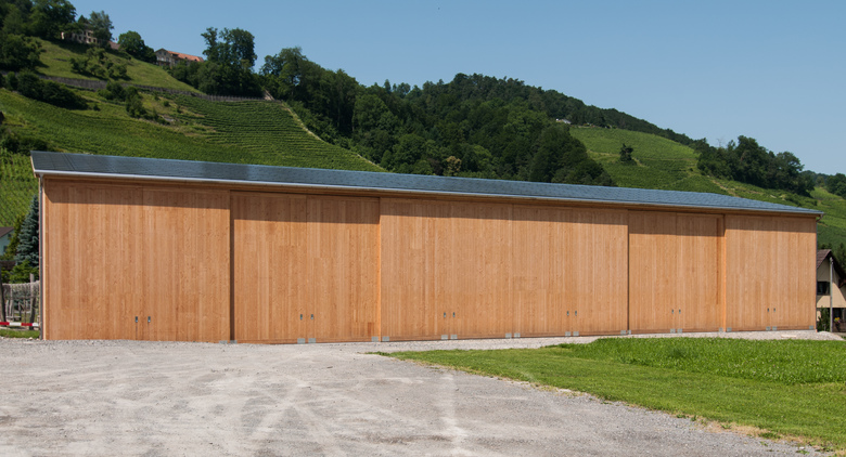 zweigeschossige Lager- und Einstellhalle aus massivem Brettsperrholz, Dacheindeckung 320m2 Photovoltaik-Paneele, Städtebauliche Begrenzung einer Platzsituation im Dorfzentrum, CO2 neutraler Baustoff – Plus-Energie-Gebäude!