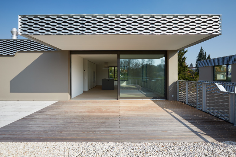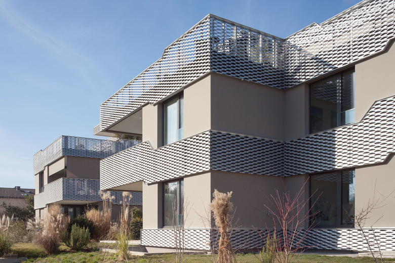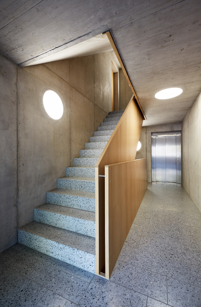 Im Gegensatz zu den konventionell materialisierten Wohnungen (Weissputzoberflächen, Parkettböden) sind die Treppenhäuser bewusst roh gehalten, mit Betonoberflächen, Kunststeinböden sowie eichenfurnierten Türen und Treppenbrüstungen. Die Materialisierung aussen unterstützt das volumetrische Konzept. Die Holz-Metall-Fenster sind allseits in die hintere verputzte Fassadenschicht integriert, wobei auch die Stoffstoren farblich auf die Putzfarbe abgestimmt sind. Die vorgelagerten umlaufenden Bänder aus Streckmetall bilden Brüstungen und Dachrand und verlaufen dynamisch zwischen den wechselnden Höhen der Fenster und Balkonbrüstungen. Sie betonen die horizontale Schichtung der Fassade und schaffen eine starke Verbindung der beiden Gebäude.