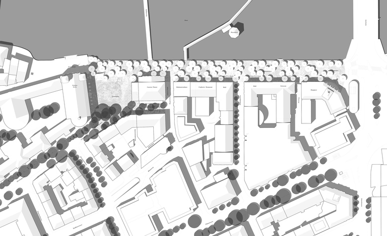 Ob dieser räumlichen Einbettung reift die Haltung, die zusammenhängenden Freiräume räumlich zu gliedern, und gleichzeitig den „Fluss“ des Raumes zu erhalten. Dieser Ansatz verfolgt auch das Ziel, einer Entflechtung der Nutzungsbereiche zu unterstützen. Insbesondere die vielfältigen Ansprüche an Verkehr und Nutzung gilt es dabei einzubinden, neu zu ordnen und zu regeln. Die Bahnhostrasse und Theaterplatz sollen ihr unverwechselbares Gesicht erhalten und sich gleichzeitig in den städtischen Kontext einfügen. Den Theaterplatz gilt es dabei besonders auch durch eigene Nutzungen zu stärken.