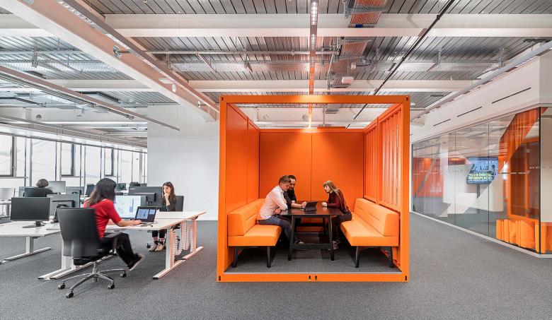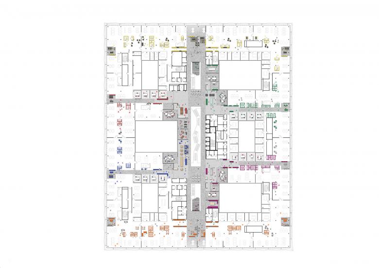 The heart of the ARENA building is the dramatic floating staircase in the atrium. Rising through the bright and spacious light well, it takes employees up to the three-story workspace section and offers exciting views into the atrium, across the open-air level out over the campus, and up to the office floors. A central “main street” links these three levels both vertically and horizontally to create a space akin to a lively marketplace suspended in mid-air. On each floor, the “main street” is adjoined by six kitchen hubs representing six “key cities” characterized by distinctive materials, colors, and types of furnishing to form individual addresses within the building. Work areas alternate with areas for formal and informal meetings and recreational zones. They are organized as variegated clusters around light wells of different sizes optimized to supply ample natural light.
