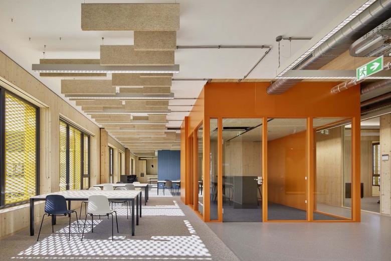 With renewable building materials and resource-saving use of existing infrastructure, Münster University of Applied Sciences has expanded the Fachhochschulzentrum (FHZ) on Corrensstraße. Behnisch Architekten, in collaboration with Berghaus Architekten, has planned a new upper floor in timber construction that complements the existing building, built in 1974 and renovated in 2014. The interior clay ceiling has both a cooling and warming effect and naturally regulates the humidity in the rooms. On the outside, the roof will be covered with a photovoltaic system and additional greenery, preserving the natural water balance and increasing biodiversity.