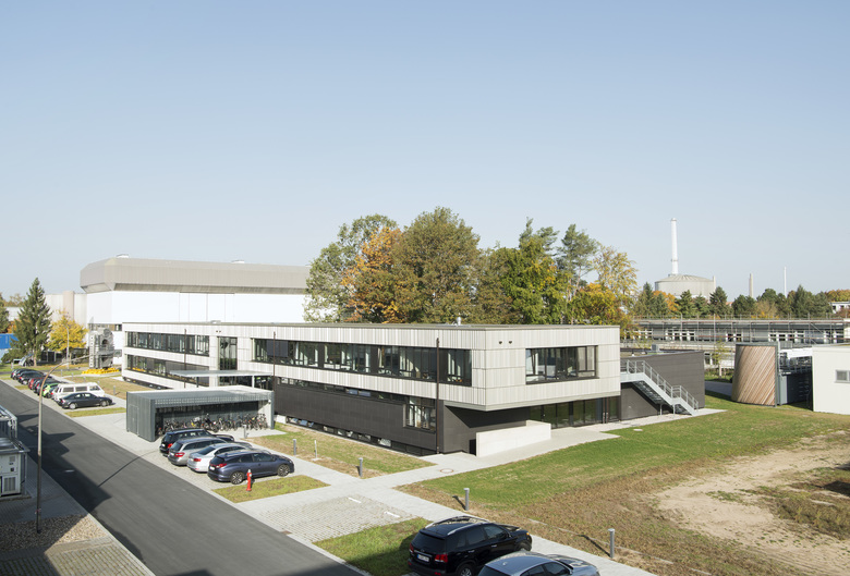 Sheet metal and fiber-cement facades emphasize the usages within: the offices and lab rooms, lecture and seminar rooms. A vertical metal façade which is individually folded is drawn as strips across the entire length of the building volume. The bright color of the metal creates a pleasing contrast to the dark fiber-cement façade of the teaching and seminar rooms which accentuates the stretched shape of the building with its vertical orientation.