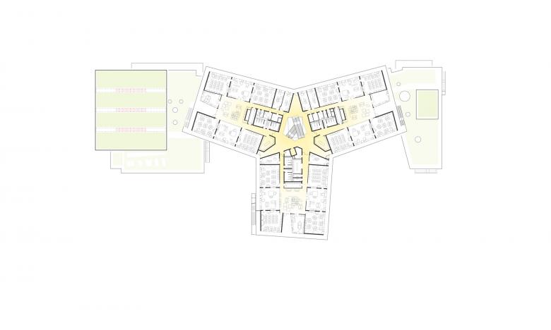 The two star-shaped upper storeys, set above one another, contain a total of five learning houses, as well as a smaller learning house for the subject-based classes on the first floor. The roofscapes on the first floor are embedded in dense roof greenery and provide space for the school garden, smaller events, seating and further utilizations such as the caretaker’s house in the form of a roof pavilion on the house for children.