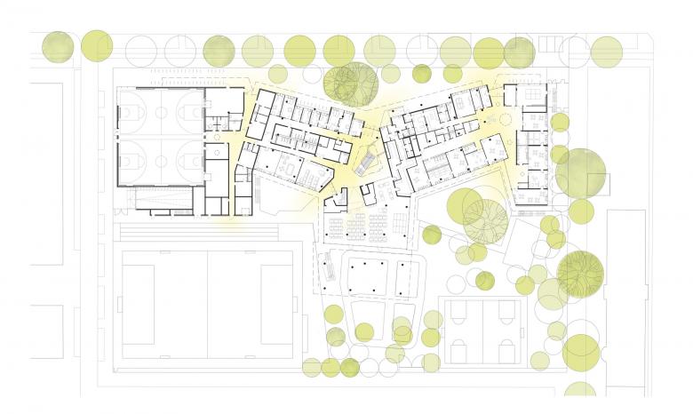 The learning house building sections are star-shaped and grouped around a central, spacious stairwell. The school building develops around this core. It forms the vertical and horizontal access- and orientation axis within the building, the place for encounter and communication with visual links to the sports hall, to the school canteen and to the outside spaces. From here, the music rooms and staff rooms, sports hall and administration tract can be accessed, as well as the dining hall and multi-purpose room, which are transparent from all sides and can be linked together. The house for children is partly inserted underneath the school building, while the other half is set like a pavilion in the green area.