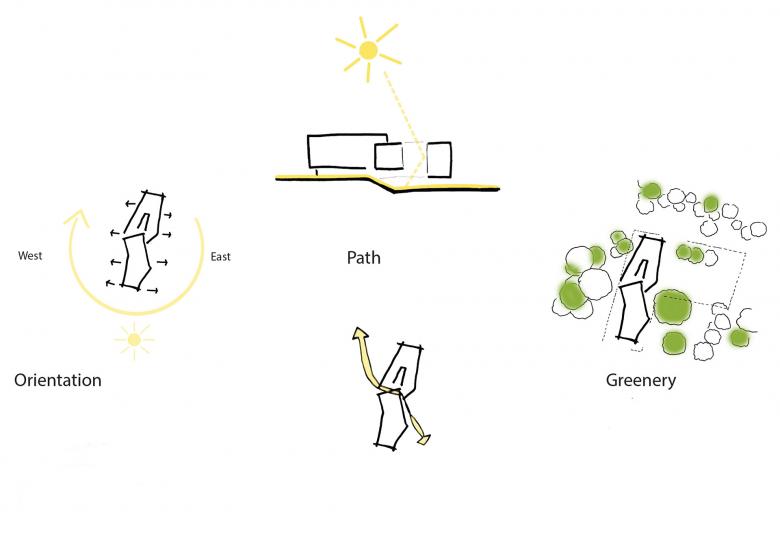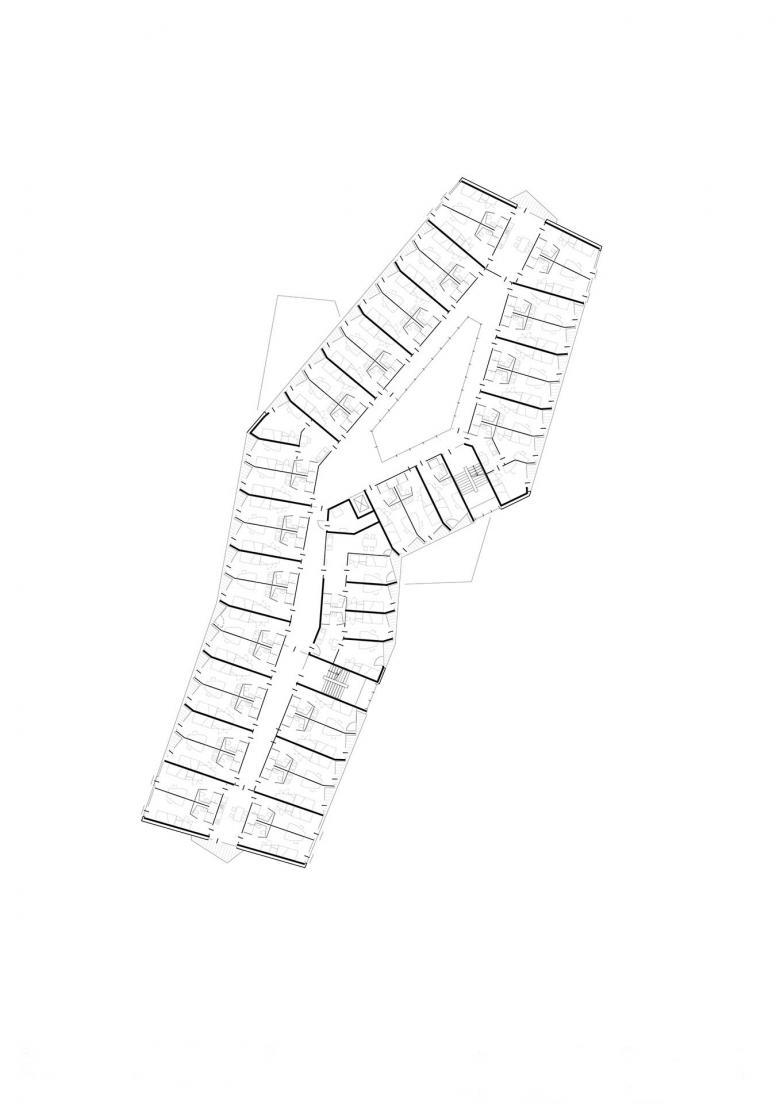 The skewed axial alignment of the elongated, five-story building, which is staggered in height along its eastern side, allows the structure to keep its distance from the existing oak and helps create a striking entrance area. The northwest side offers additional space for premium, open-air leisure areas.