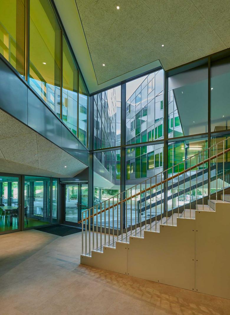 The exterior of the building is defined by the balconies’ play of light and shadow. The distinctive coloring of the closed glass panels is inspired by the seasonal color changes of the surrounding trees. The slanting elements of the facades help block the view to neighboring balconies while at the same time offering structural protection from the sun. The continuous handrail and parapets, filled with stainless-steel meshwork, reinforce the appearance of transparency and, together with the light-colored banding, give horizontal structure to the facade.