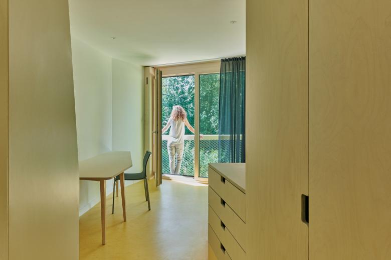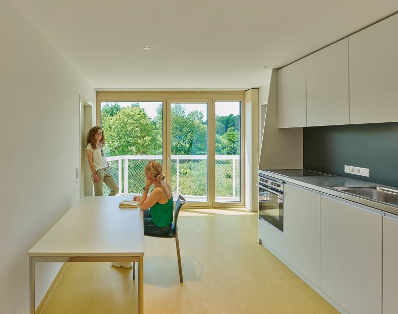 In contrast to the accented coloring of the communal areas, the individual student rooms, each with their own balcony, built-in kitchen, bathroom of finished sheet-metal components, are kept warm and tactile and are furnished with polygonal wooden furniture. Heating is provided by finned tubes—mounted vertically next to the window frames—that have an integrated ventilation system. This type of heating regulates the intake of fresh air, thus guaranteeing optimal air quality and a comfortable environment for residents.