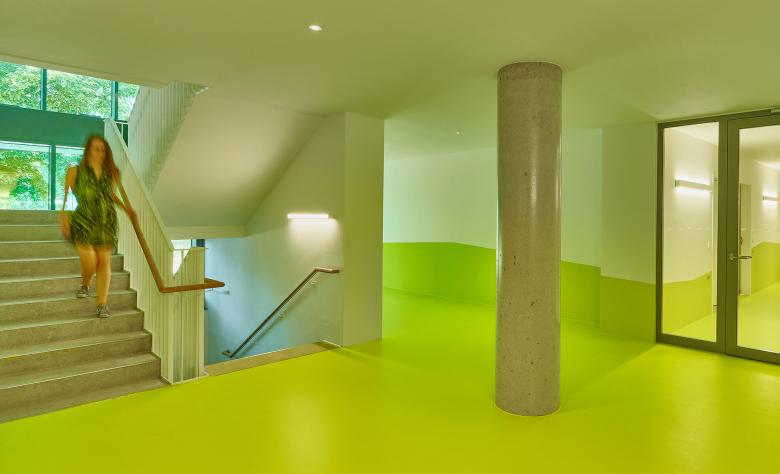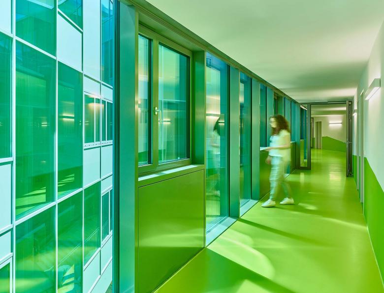 The residential units—with a total of 204 beds located in 138 individual apartments, each measuring ca. 19 m2, 17 shared spaces for two people, and 8 for four people—face either toward the west or east. The access areas widen at specific points and, along the north side of the building, open onto a central courtyard that traverses all floors, allowing for natural lighting and ventilation and offering yet another space for students to meet in. The closed elements of the facades reflect daylight and sunshine onto the sides of the corridors opposite and become increasingly transparent in the lower stories. Different color tones on the floors and walls, coupled with textual and graphic elements, help guide visitors and residents through the building.