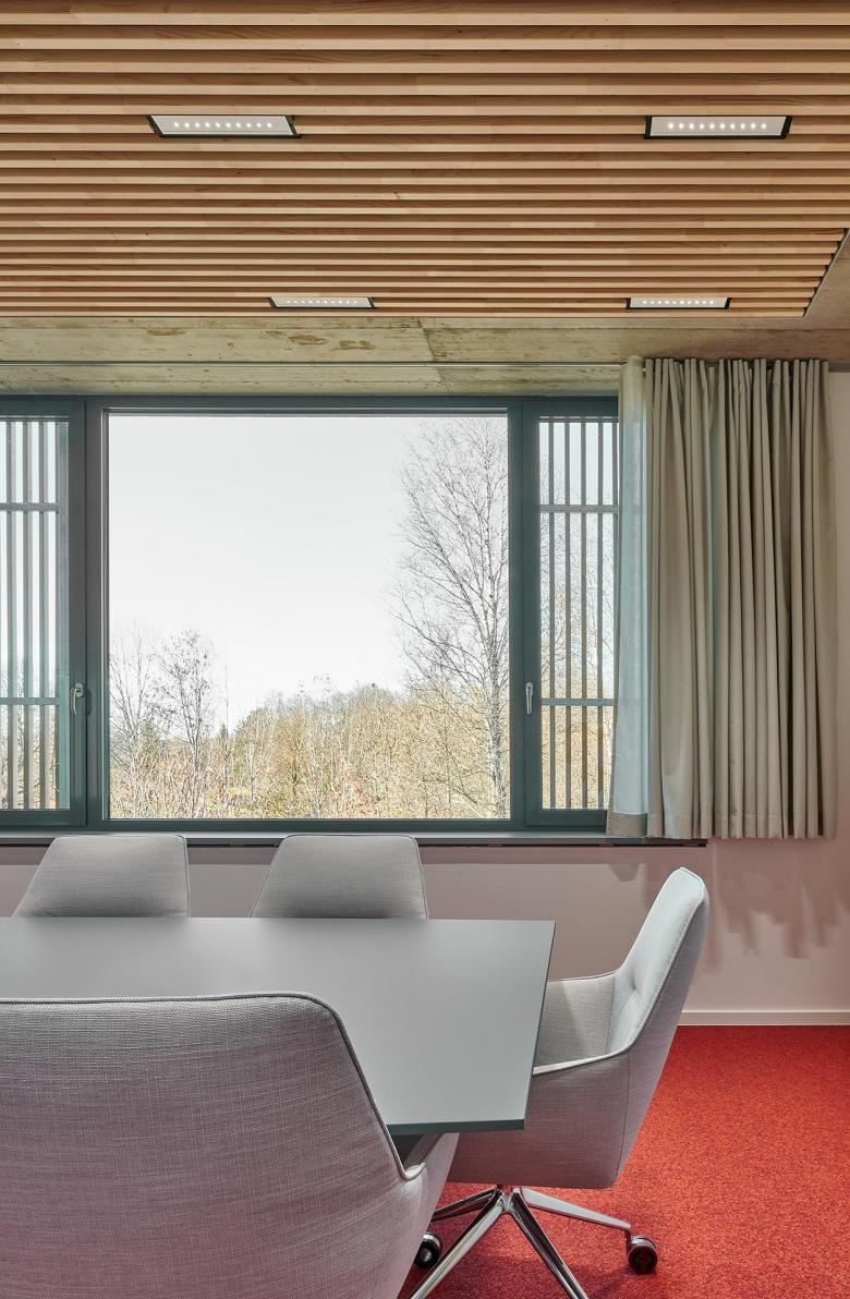 As they have distinct functions, the facades of the two levels are different. While the transparent and open glass surfaces emphasize the building’s public function and link it directly to the surrounding area, on the upper level, open surfaces alternate with closed expanses of pre-grayed larch. The window areas are fitted with sliding shutters, composed of vertical wooden slats, that can be opened and closed by hand, providing an effective shading device. The use of three different layers on the facade gives the building a striking and distinctive appearance.