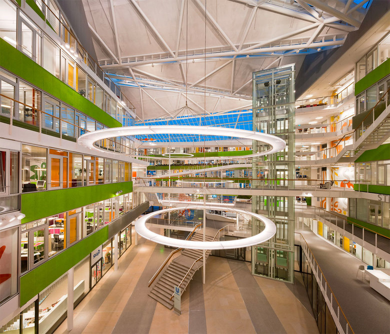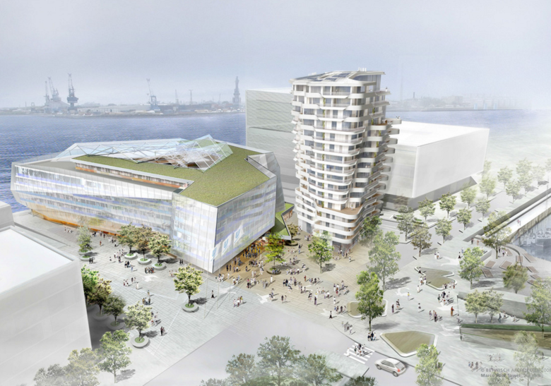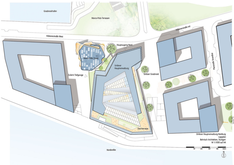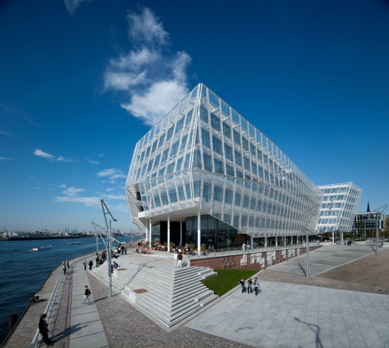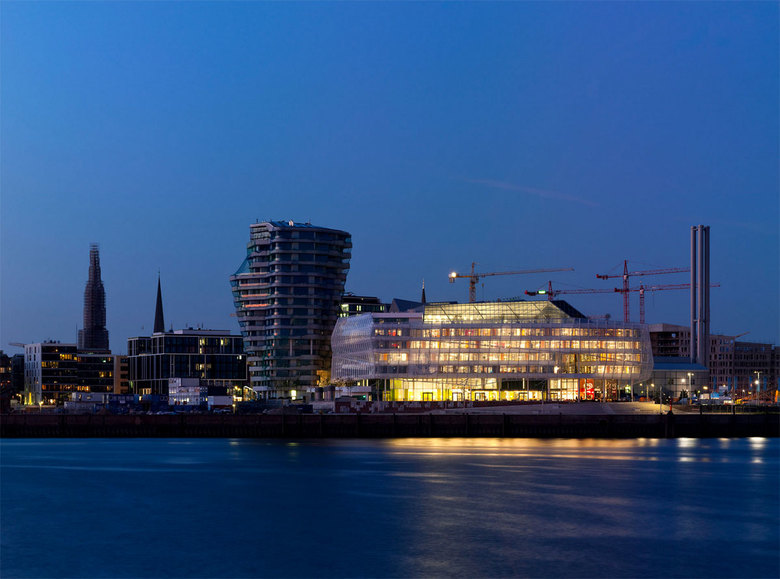 The new Unilever headquarter building for Germany, Austria and Switzerland is located right by the river Elbe in Hamburg’s HafenCity. It marks the end of the route out of the town centre to Hamburg’s new attractions: the cruise ship terminal and the promenade on Strandkai. Here Unilever’s new building opens itself up to the city and its inhabitants. The central element and heart of the design is the generous atrium, flooded by daylight, which, on the ground floor, gives passers-by the opportunity to get to know the company better while browsing in the shop stocked with Unilever products, sitting in the cafe or relaxing in the spa. The atrium is also the central location for people to meet and communicate. As in a city, bridges, ramps and steps connect central spaces with each other. Here people can meet, talk and enjoy the inspiring ambiance. Vibrant and communicative interaction evolves, thereby fostering a feeling of togetherness among the employees. The workplace is no longer a separate department. The building itself reinforces the identity of the company. The building follows the principles of holistic, sustainable architecture. While implementing technologies that help save resources, the energy concept adheres to the principle of avoiding technical solutions wherever possible. The office area is cooled by means of thermally activated reinforced concrete ceilings. A single-layer film facade placed in front of the building’s insulation glazing protects the daylight-optimized blinds from strong wind and other weather influences. The building’s primary energy consumption during operation will be under 100 kWh/a m². A newly developed SMD-LED system has been deployed both for the building’s general lighting and for workplace lighting. This system is up to 70% more efficient than conventional halogen or metal halide lighting. The Unilever building received the newly established HafenCity EcoLabel in gold.