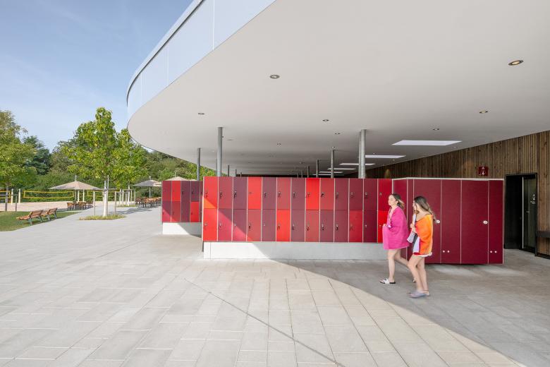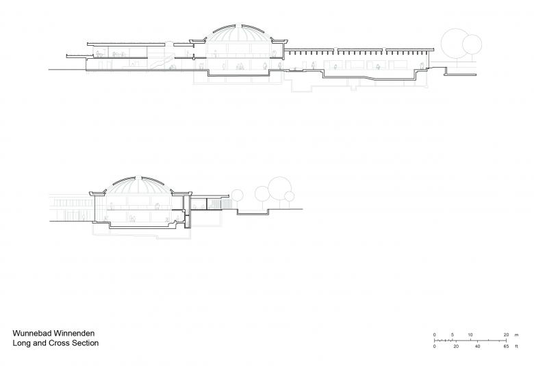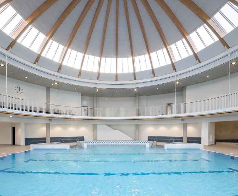 The design concept draws inspiration from the unique surroundings, incorporating the topographically shaped open spaces of the outdoor pools and the existing Wunnebad to formulate a central idea that harmoniously connects the old and the new. At the heart of the new facility stands the striking domed structure of the original bathing hall. This is complemented by a composition of curved roofs and organic forms, which ef-fortlessly integrate the various functional areas. The form of the reworked building re-sponds to its context with sensitivity, blending seamlessly into the environment.