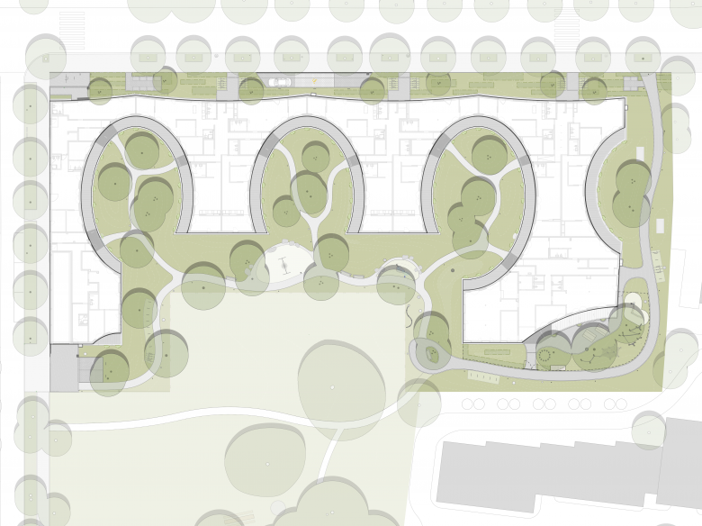 Die Gebäudefigur wurde durch Verschiebung der im Süden unmittelbar vorgelagerten, öffentlichen Grünfläche möglich. Dadurch ist ein einmaliger, attraktiver Verbund zwischen der Wohnsiedlung und der kleinen Parkanlage mit ihrem sehr schönen Baumbestand gelungen. Geschwungene Wege führen durch die Grünflächen hindurch und betonen die parkartige Situation. Daran angelagert befinden sich Angebote für Aufenthalt und Spielbereiche sowie Abstellmöglichkeiten für Velos.