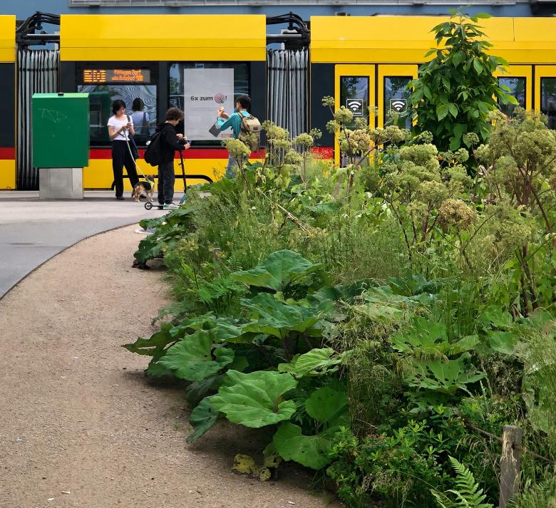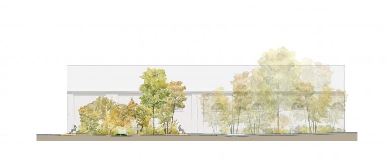 Üppige, baumbestandene Vegetationsinseln bilden den grösstmöglichen Kontrast zum städtischen Umfeld. Ihre Form und Lage ergibt sich aus den platzquerenden Erschliessungsströmen. Sie bilden im Zusammenspiel mit der Wassermulde einen Ort, der das Potential hat inmitten der umgebenden, dynamischen Verkehrsräumen eine eigene, entschleunigte Atmosphäre zu bilden.