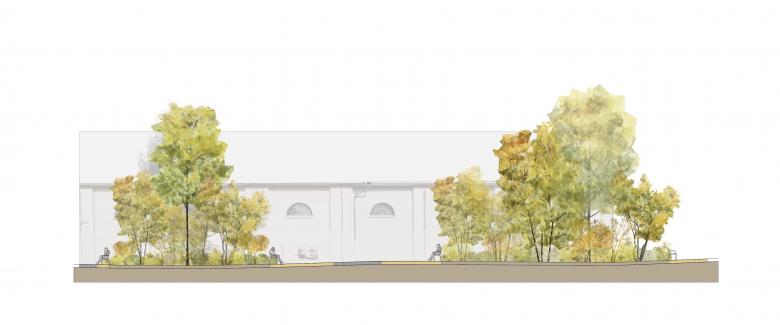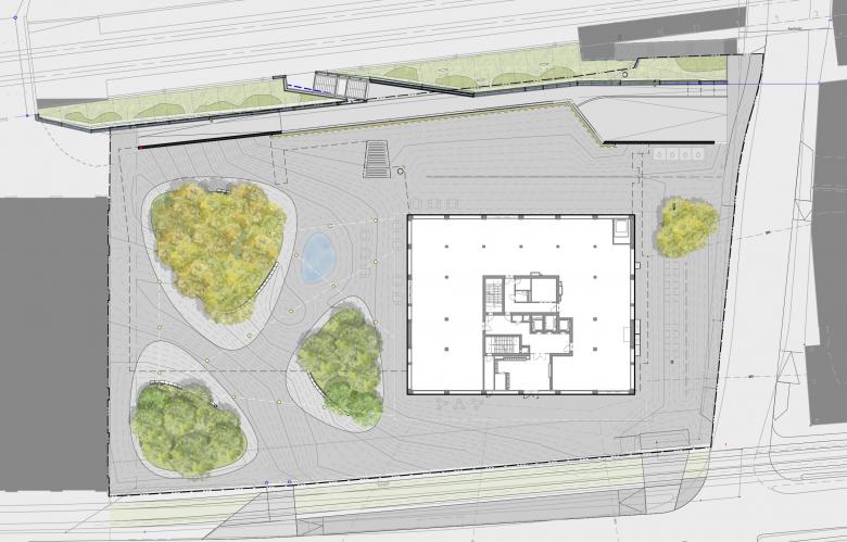Der neue Irène Zurkinden - Platz im nördlichen Bereich des Stadtteils Dreispitz wird durch das bestehende Tramdepot und den prägnanten Neubau, sowie durch die Tramstation und die transparente Kante zur S-Bahn-Station gefasst.