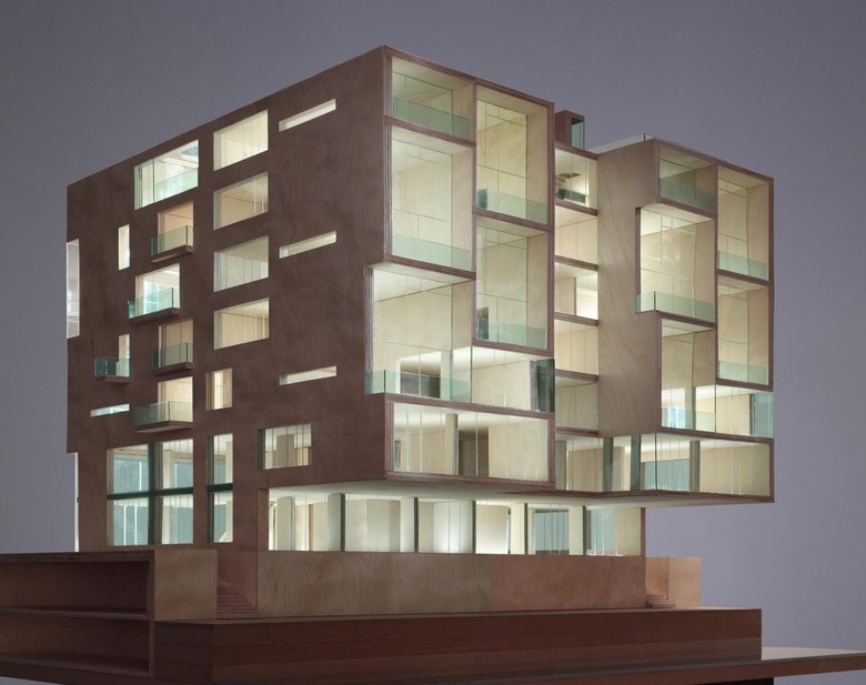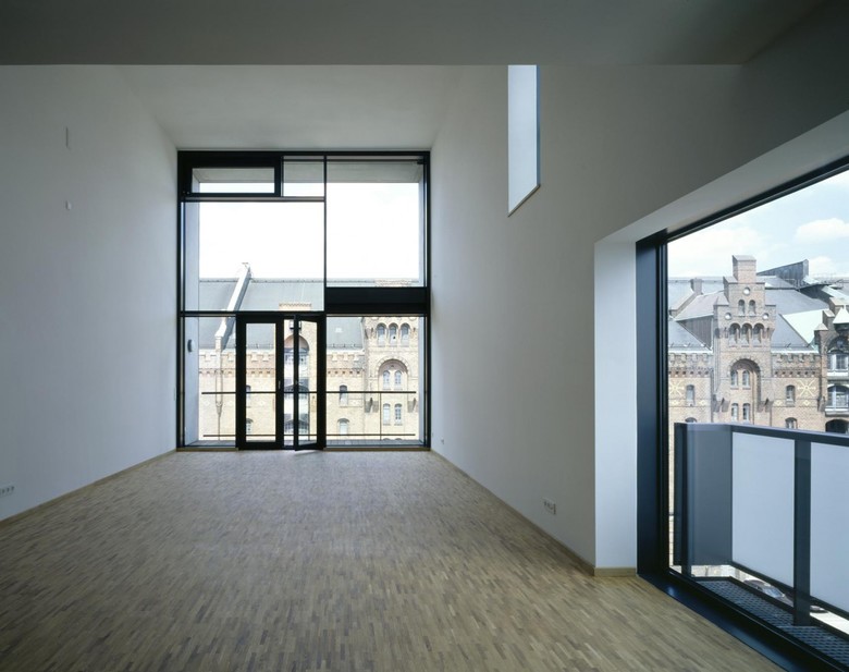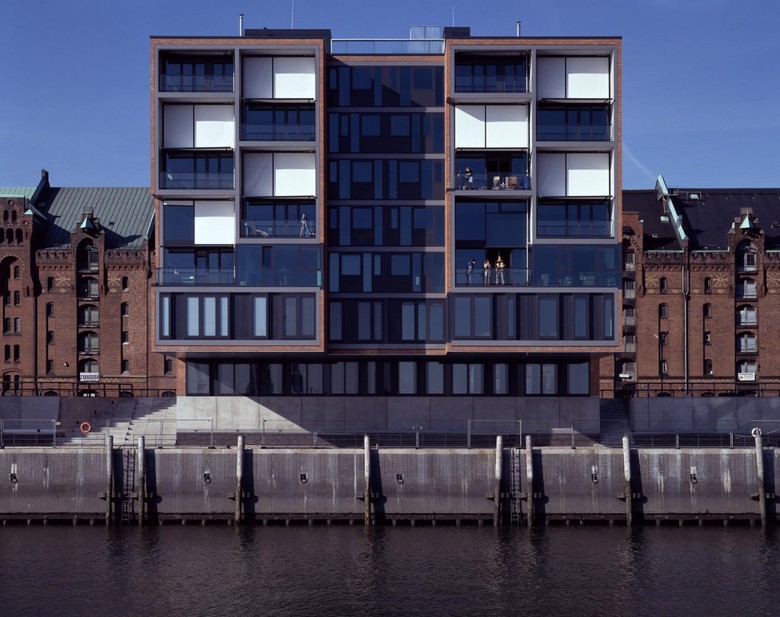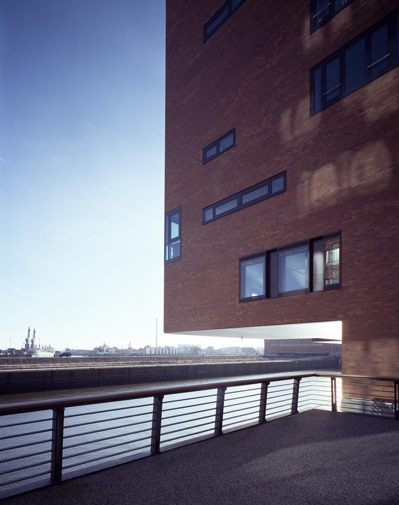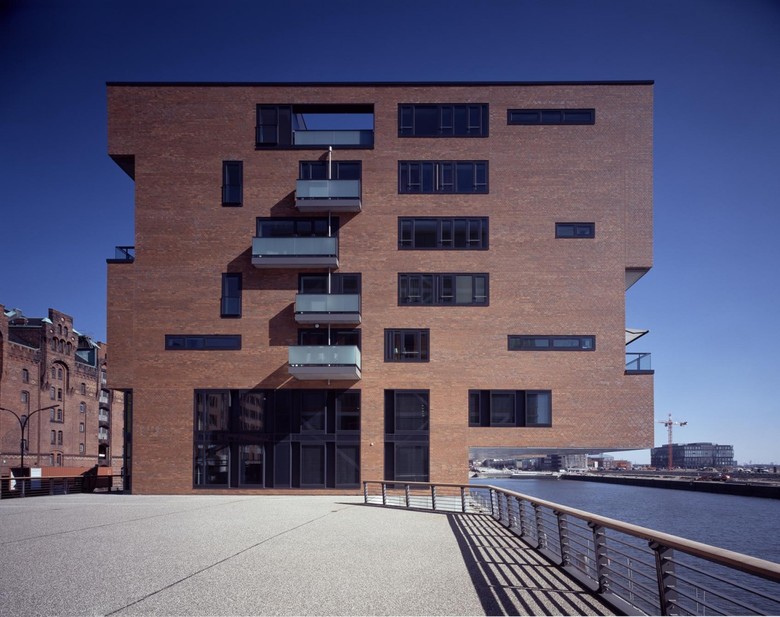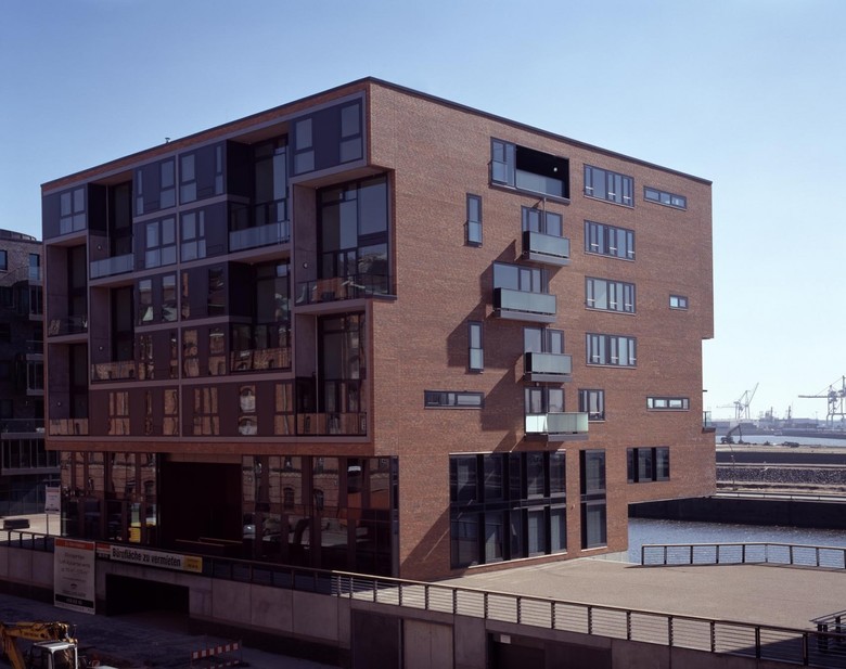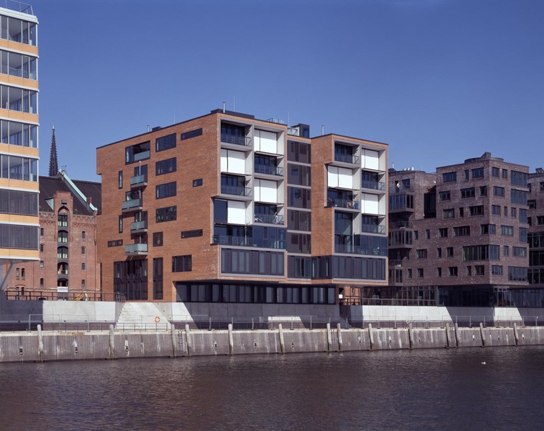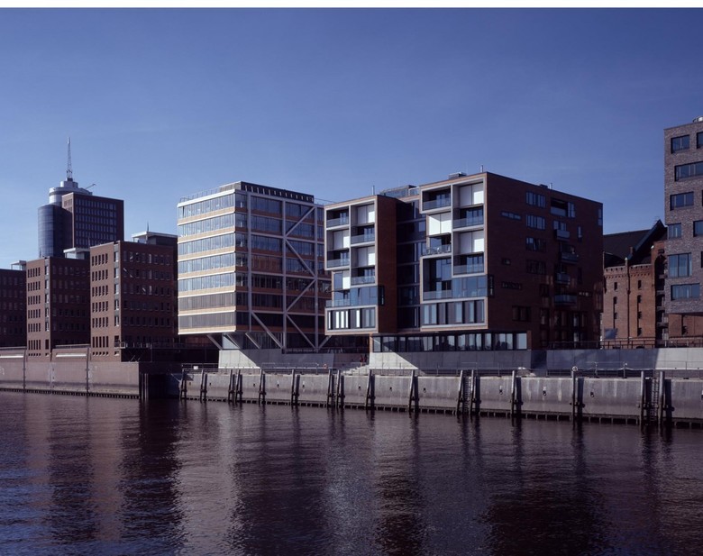 Als eine der ersten Baumaßnahmen der Hamburger HafenCity entstanden am Sandtorkai acht kubische Solitäre auf einem gemeinsamen Sockelbau. Der kubische Charakter der Bauten erhält durch die geforderte Auskragung zum Wasser eine fast dramatische Dimension. Eine außerordentlich komplexe Fügung der Wohnungen führt zu einer Abstraktion und eigenen Interpretation des Konstruktiven. Die Wohnungen sind als flexible, offene Raumzonen konzipiert, mit einem 2-gesch. Hauptraum, orientiert zur Speicherstadt oder zum Wasser.